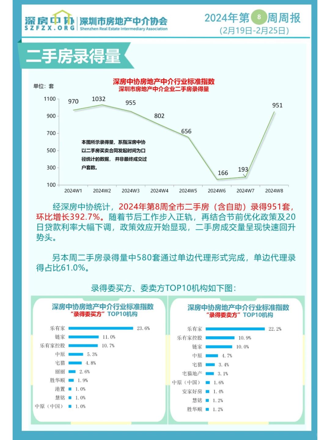 深房中协数据:2024年2月26日,深圳全市有效在售二手房源51856套,在售二手房源比上周增加2176套。上周(2月19日-2月25日)全市二手房录得951套,已经恢复到春节前深圳二手房的周录得量。 在207新政+按揭降息后的双重利好下,深圳二手房录得量呈现快速回升势头。