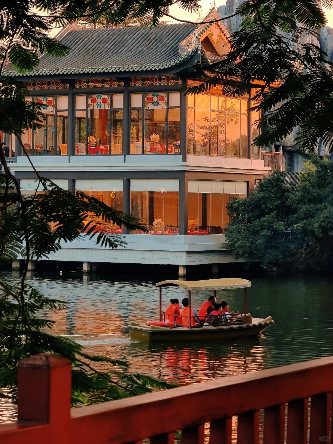 6️⃣荔湾湖公园:5点左右太阳开始下山,荔湾湖上会洒满碎金,湖边的西关老屋全都波光粼粼,老人孩子在湖边嬉戏,湖上还可以🚢游船,非常惬意