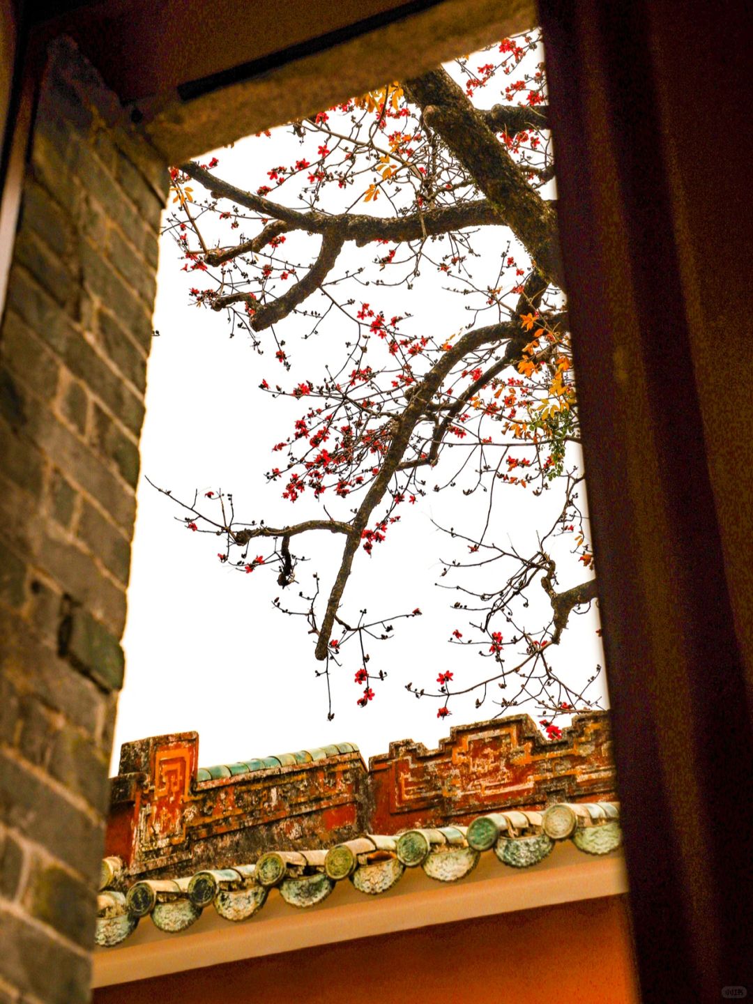 红墙绿瓦的古建筑,搭配火红明艳的木棉花,