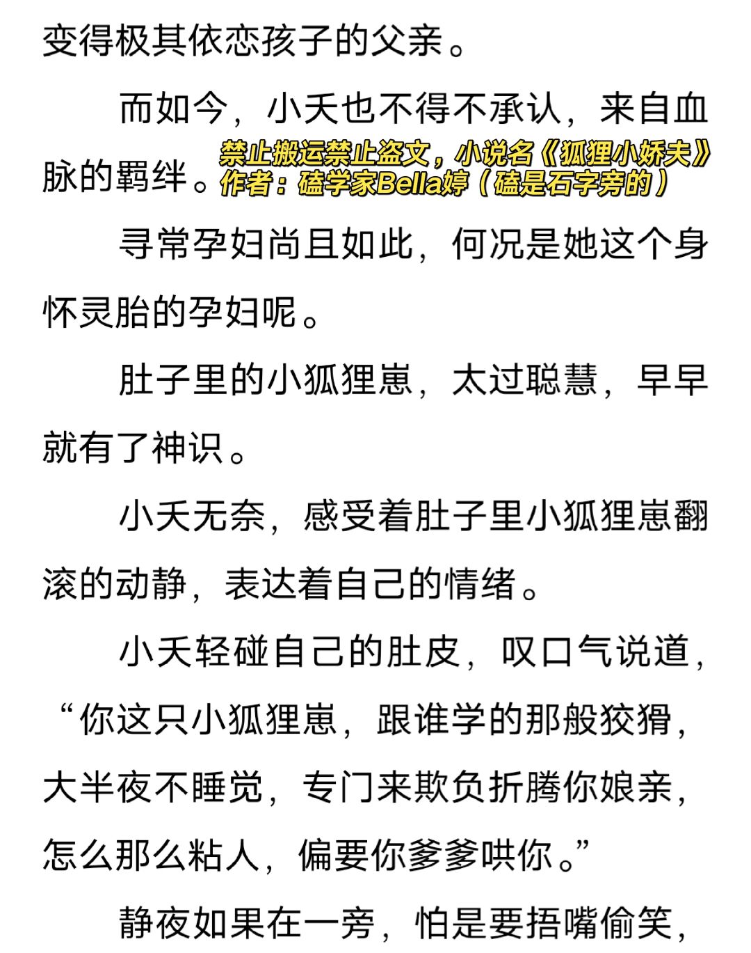 小夭轻碰自己的肚皮,叹口气说道,“你这只小狐狸崽,跟谁学的那般狡猾,大半夜不睡觉,专门来欺负折腾你娘亲,怎么那么粘人,偏要你爹爹哄你。”