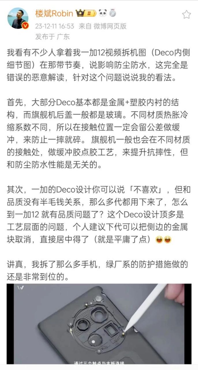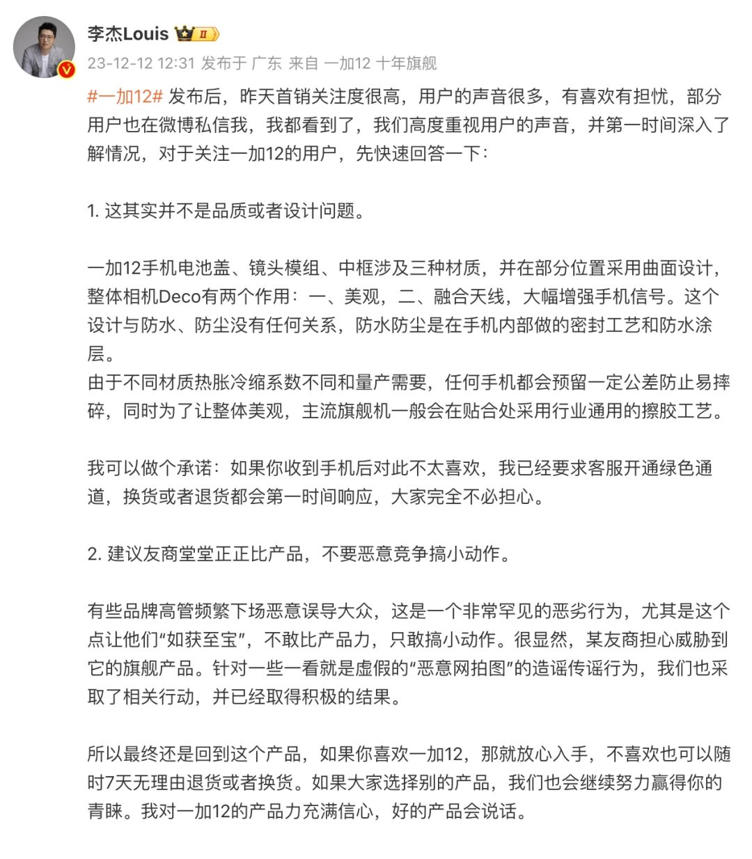 机圈品牌卷已经是行业常态了,不过好久没有看到这种阵仗了。 最近一加12发布之后,小米的高管好像按耐不住了,一再发声对一加12发表一些观点。网上关于一加12的黑料也是千篇一律来回洗。只能说找了各种角度,最终只找出“公差”这点“不足”吧。 昨天一加总裁李杰也对该事件发声,称后盖和质量、设计都无关,只是制作预留的公差。面对用户的声音,李杰也表示如果不喜欢,可以退!如果有问题,可以换!一加这番操作,可以说是非常有良心了,也间接看出了他们对自己产品的自信!