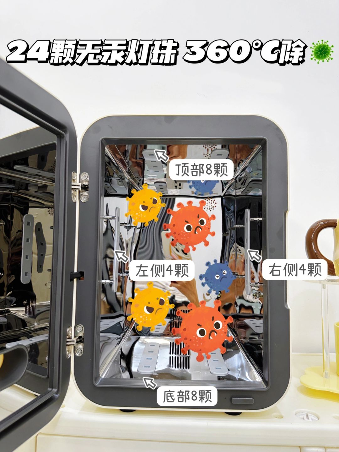 轻松完成紫外线杀菌工作,还是四维分布的,完全没有死角!而且无汞灯珠不伤奶瓶奶嘴。