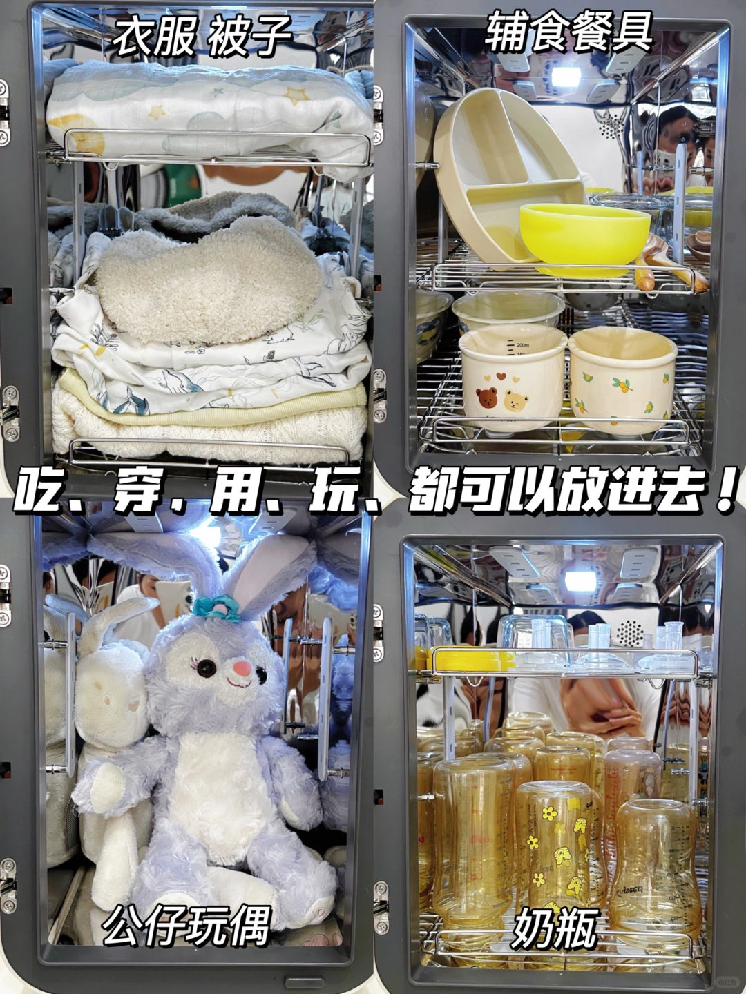奶瓶奶嘴、牙胶、辅食餐具、毛巾盖毯、玩偶 玩具啥的统统扔进去消毒烘干…