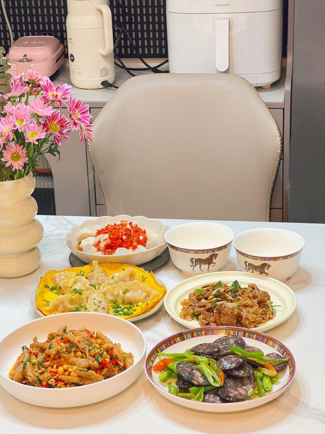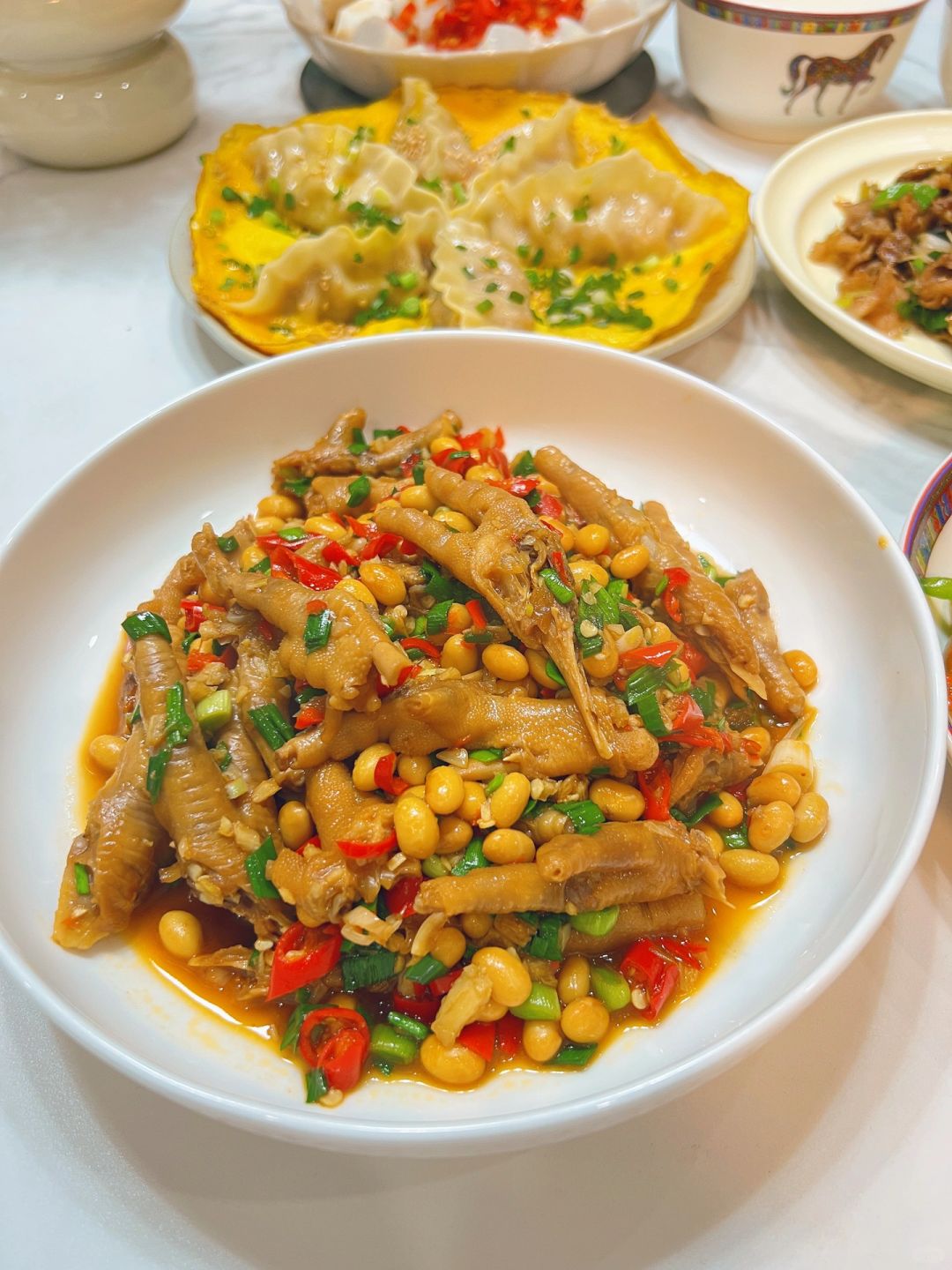 今日份菜谱🥣 🌟鸡爪焖黄豆 🌟抱蛋煎饺 🌟炒烤肥牛 🌟双椒炒黑鸭肠 🌟剁椒蒸芋艿