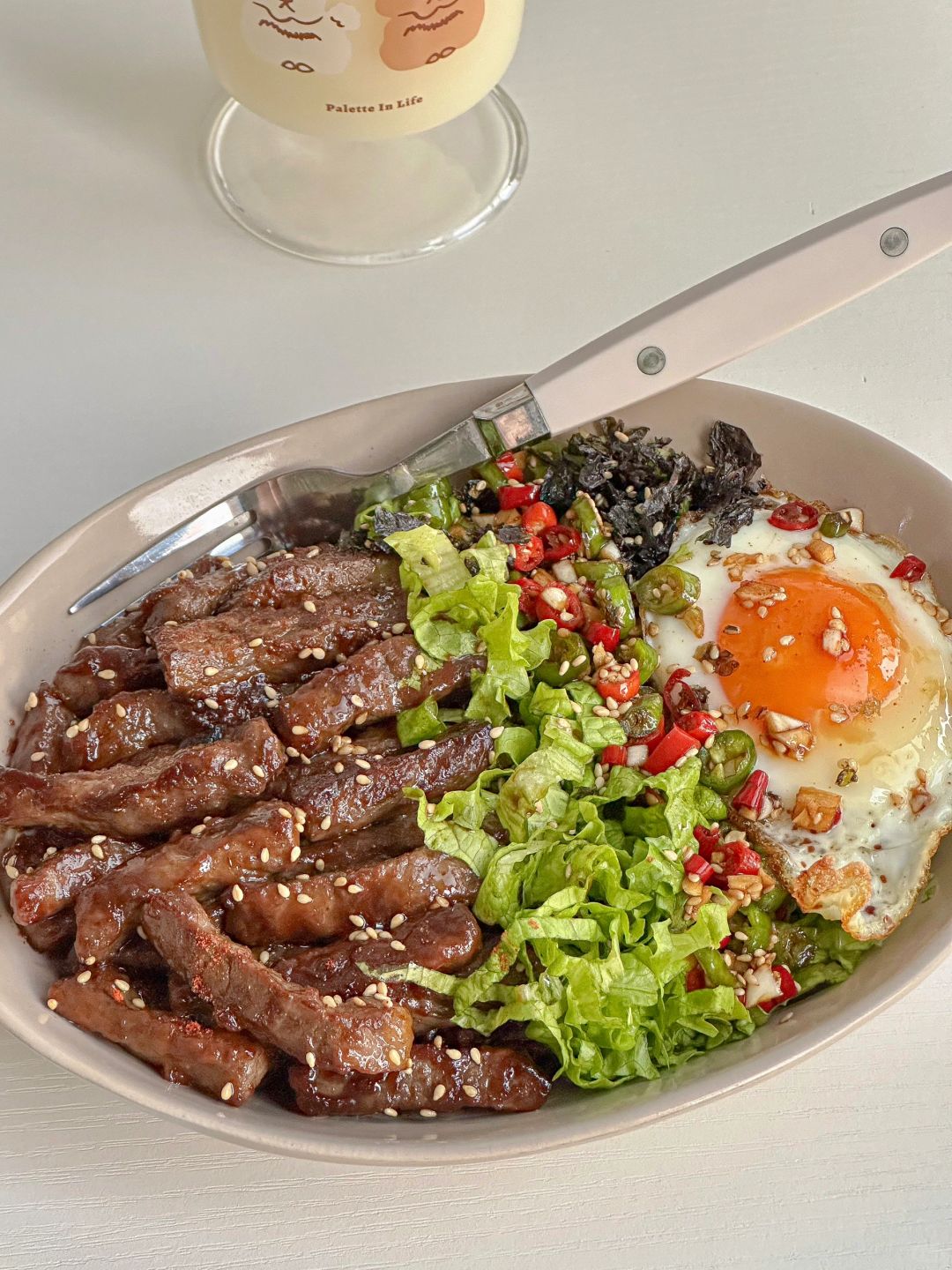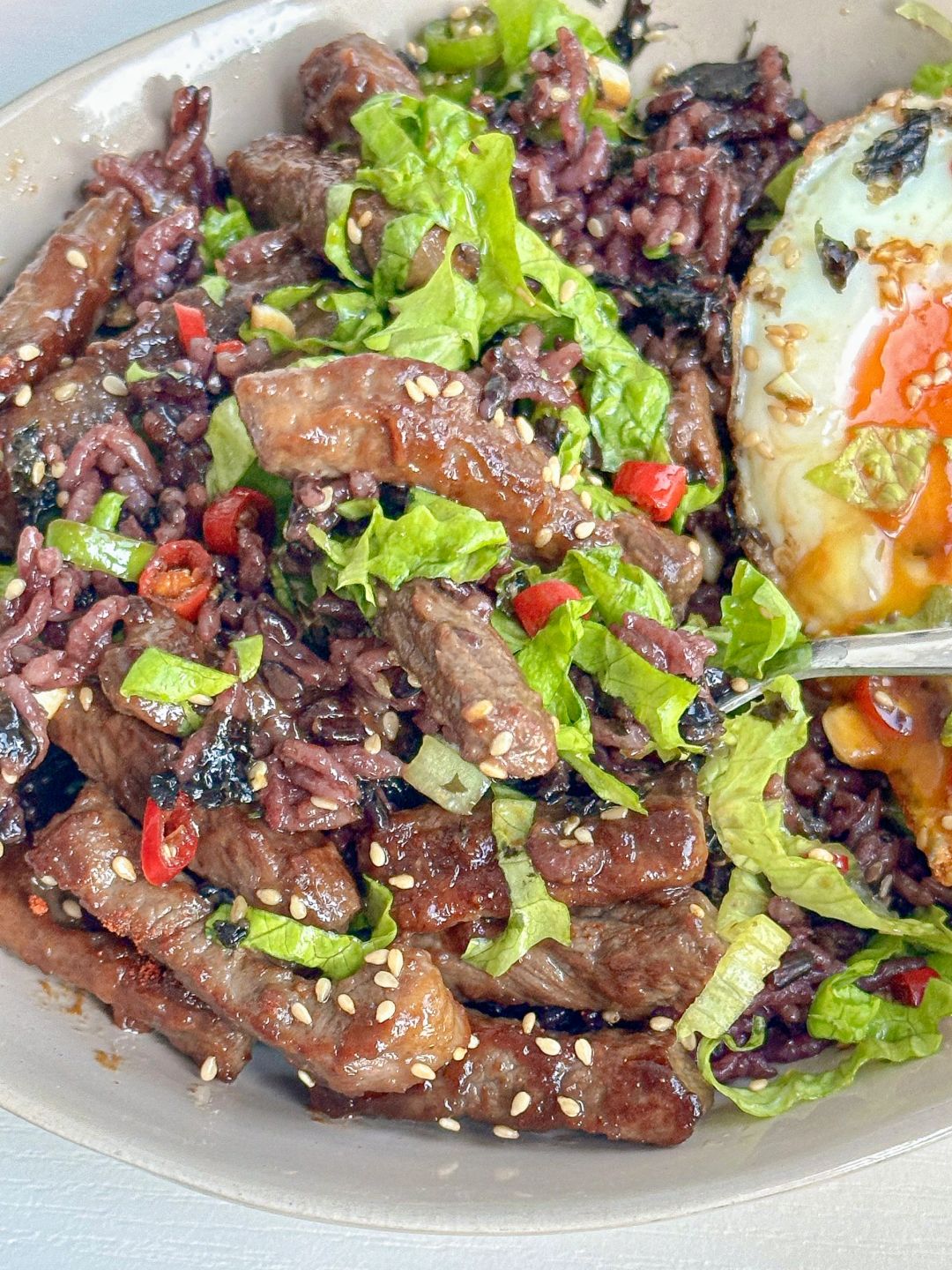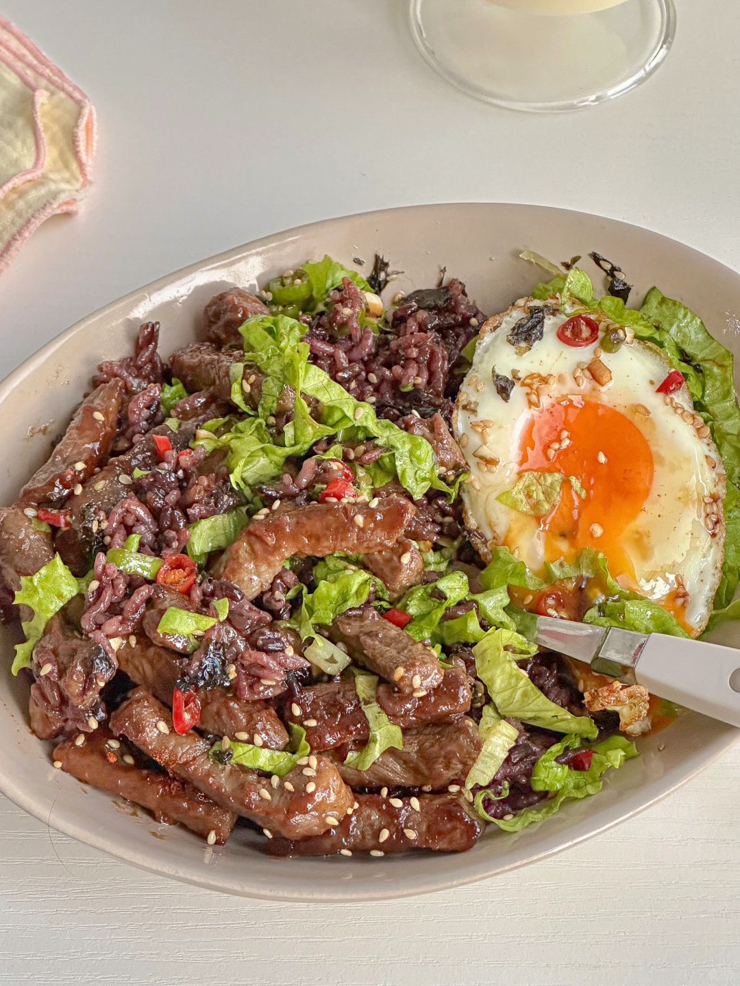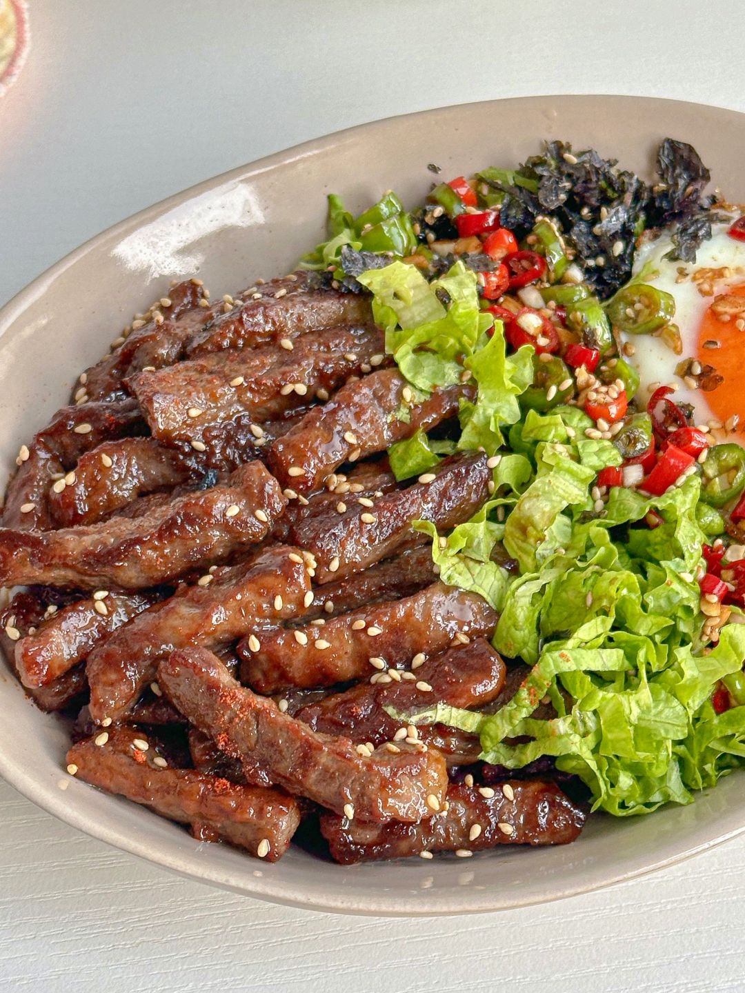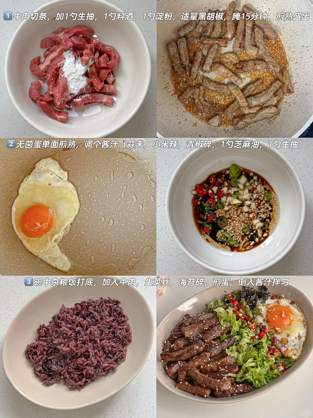 减脂期的梦中情饭~ [购物车R]食材 嫩牛肉|生菜|青椒|小米辣|可生食鸡蛋|海苔碎 🧑🍳步骤 1️⃣ 牛肉切条,加1勺生抽,1勺料酒,1勺淀粉,适量黑胡椒,腌15分钟,煎熟盛出 2️⃣无菌蛋单面煎熟,调个酱汁(蒜未,小米辣,青椒碎,1勺芝麻油,1勺生抽) 3️⃣碗中杂粮饭打底,加入牛肉,生菜丝,海苔碎,煎蛋,倒入酱汁拌匀