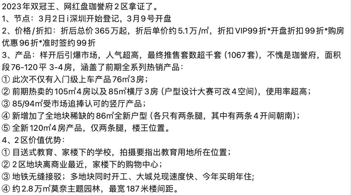 鸿荣源珈誉府 2区新品1067套折后价格已出,今日取证。 折后总价365万起,折后均价约5.1万,折扣VIP99折*开盘折扣99折*购房优惠96折*准时签约99折。相比1区5万的均价,2区首推4栋的均价涨了约1000元,但2区更近学校、更近地铁,并且不临主干道,龙少认为贵了1000元也值。 今年总价预算在350-500万准备在深圳买房的朋友,龙少都建议去看看珈誉府,刚需三宝学校、地铁、商业的配套确实没有啥对手。需要申请团购优惠的请私信联系!