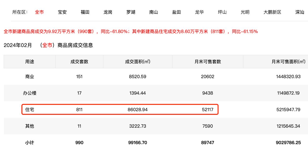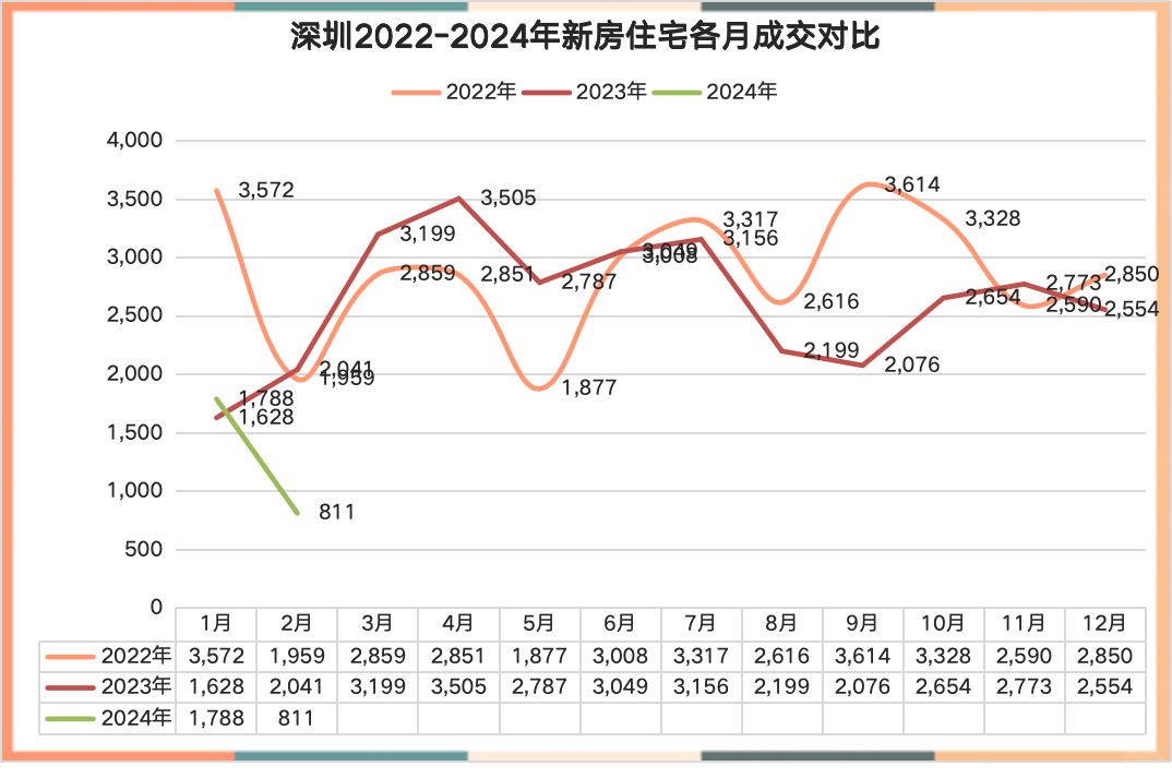 深圳2024年2月新房住宅成交811套,因2月是春节,成交量较低。并且还低于2023年和2022年的春节月份新房成交量。 深圳11区2月底新房住宅库存52117套,比1月底的51498套多了619套,库存量仍是高位,库存去化周期还是近20个月之高。预计2024年的深圳新房市场竞争将更加卷。