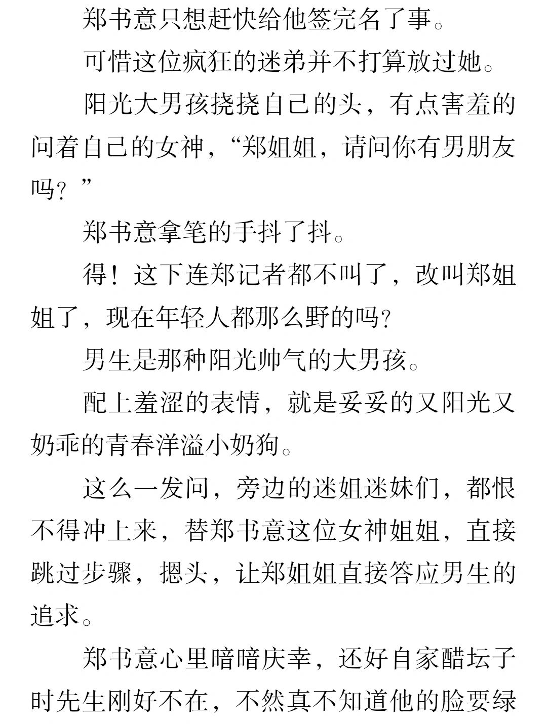 郑书意没想到,她一个普普通通的金融记者竟然能也收获疯狂粉丝,还是个男的,还比她小,用现在的话说,就是个小/鲜rou!迷弟!阳光开朗大男孩!