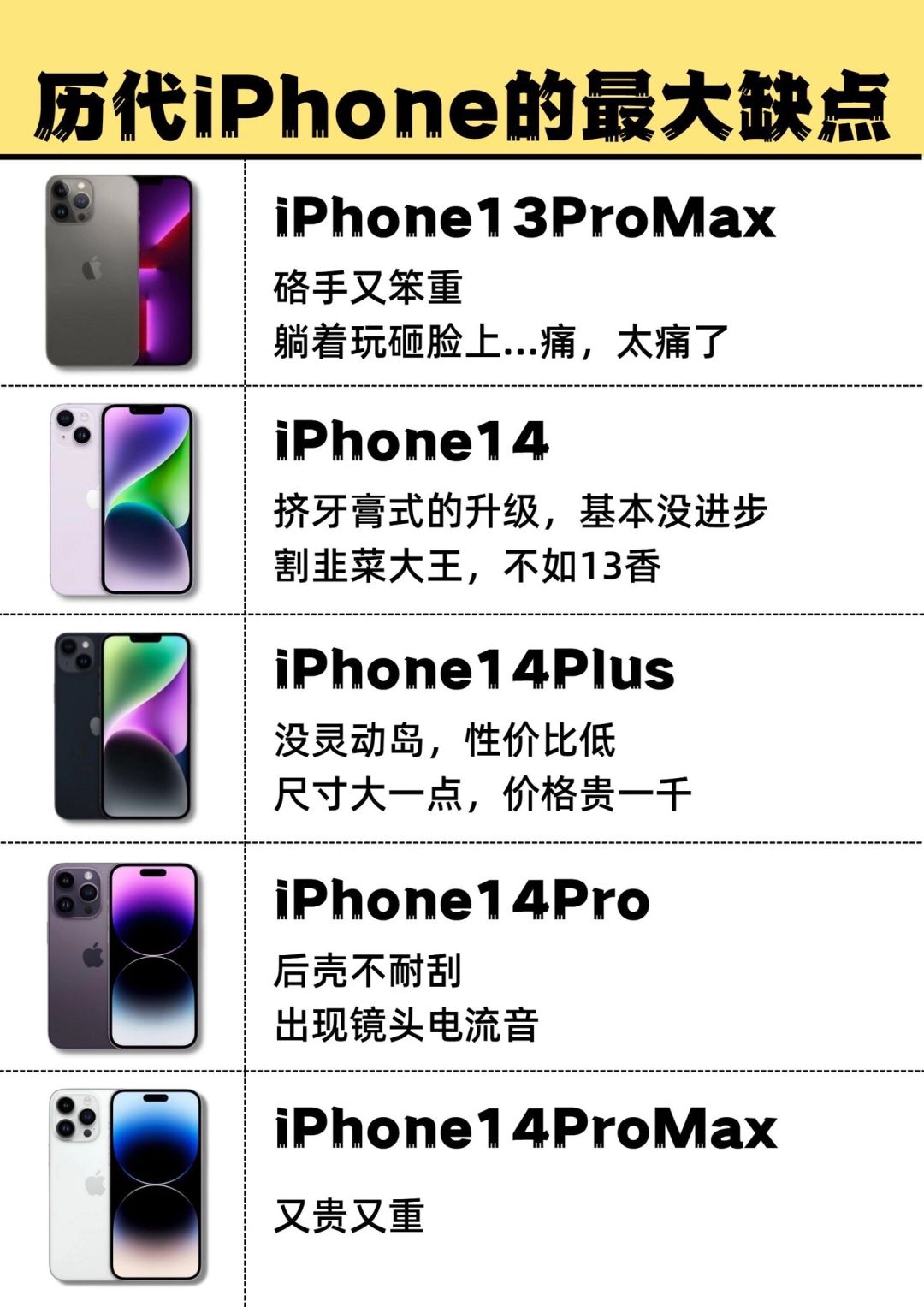 iPhoneX容易发热耗电,iPhone12的LED屏在纯黑背景下会出现屏幕边缘泛绿的现象。有些用户换了好几次货,绿到心慌。iPhone13拍照时会出现鬼影,机身过热时还会出现降频降亮度的问题。iPhone14Pro的灵动岛出现异常,拍照时还会出现电流声。但是大家公认的地方有下面两个: