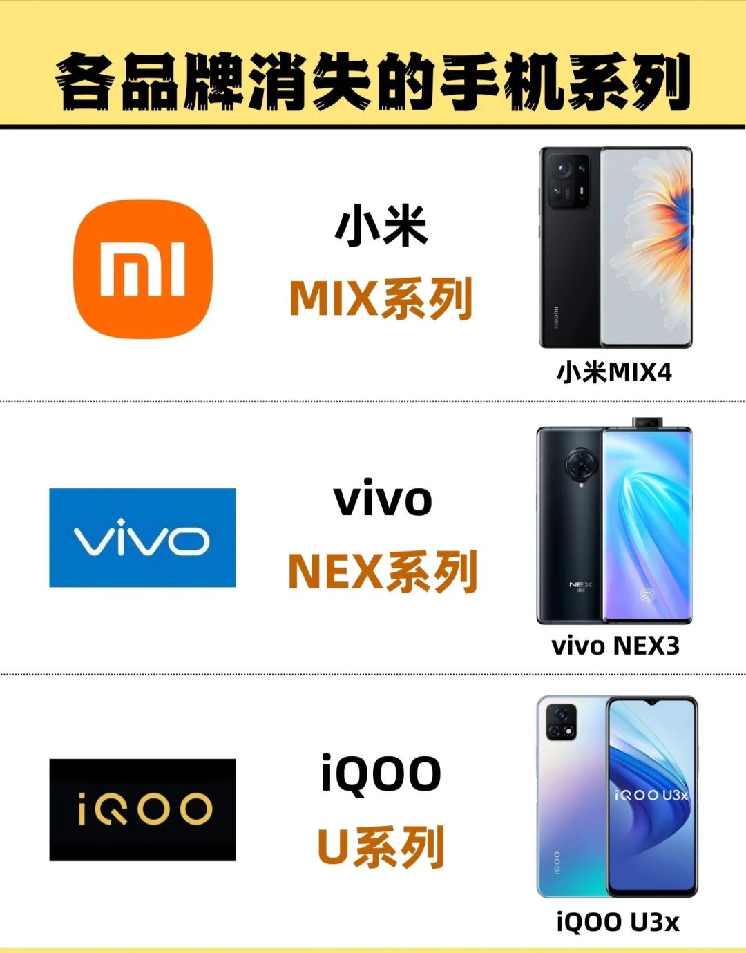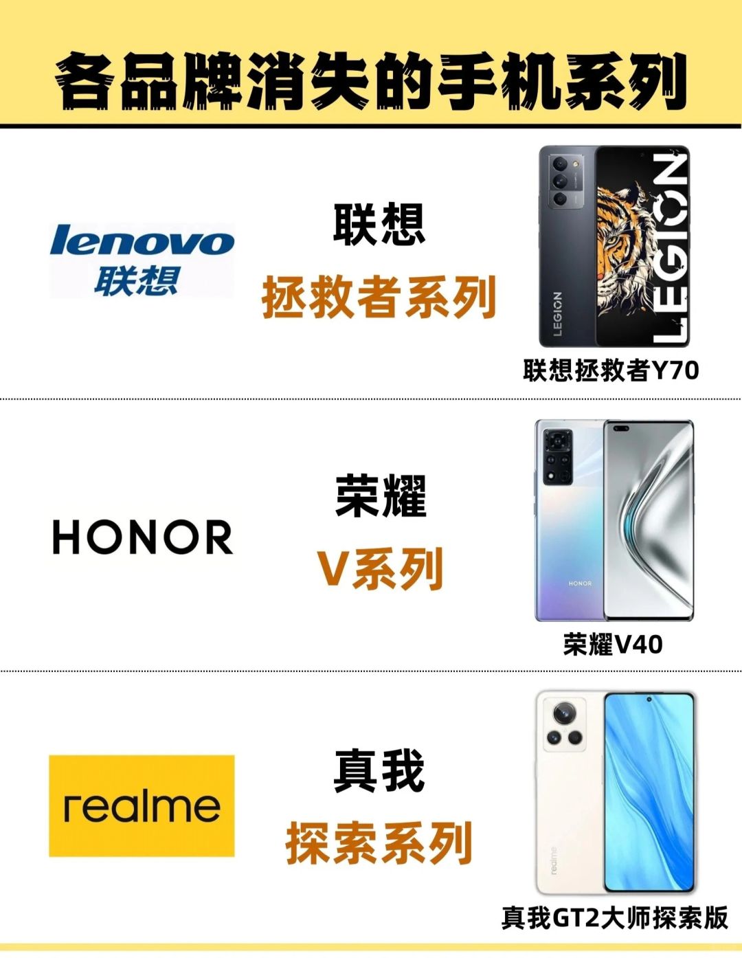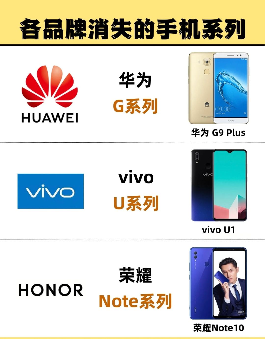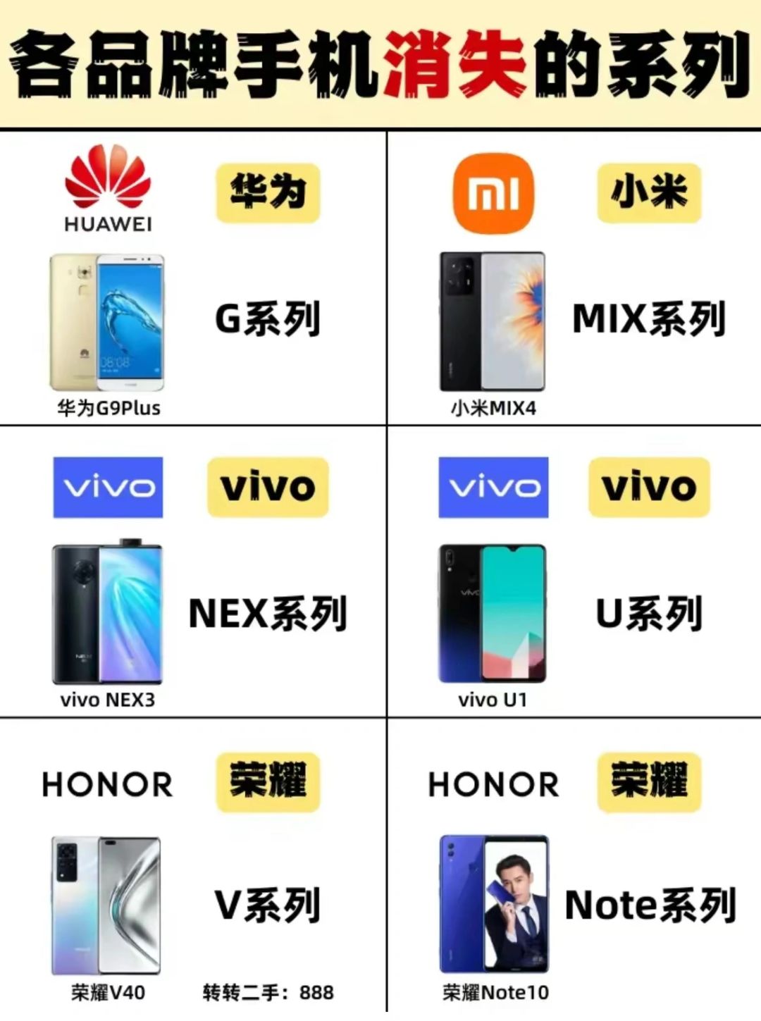 [微笑R]像华为G系列、小米MIX系列、vivo NEX系列、vivo∪系列、荣耀V系列、荣耀Note系列、OPPOR系列、魅族Note系列、真我探索系列、真我X 系列、iQOO U 系列、联想拯救者系列等等,虽然现在用起来依旧不错,但现在已经不再生产了,要买只能去看看二手的了.。