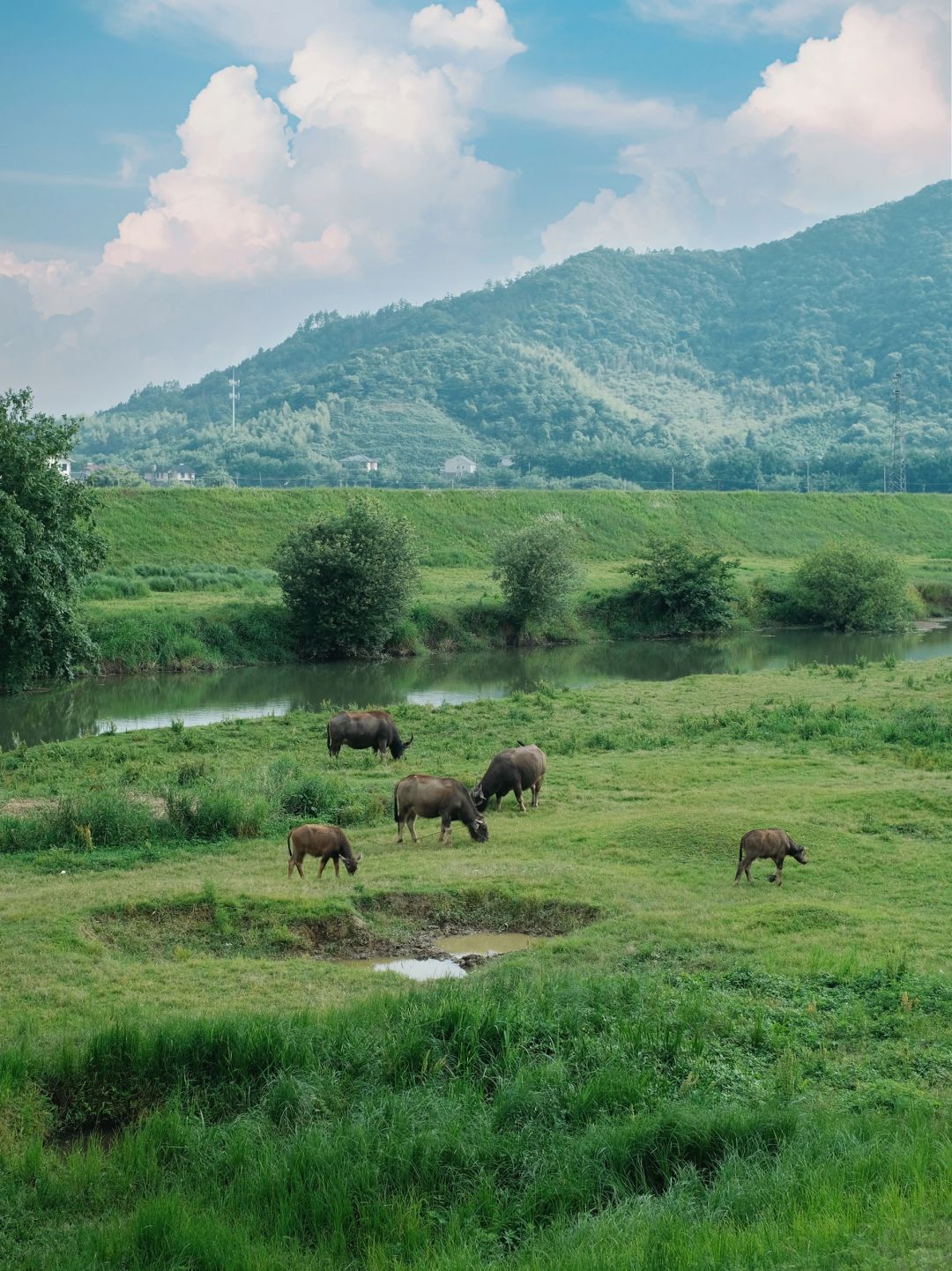 号称杭州“小内蒙”,一大片绿油油的河床草原,牧羊人和放牛者,随便扎个天幕或帐篷都好看,太适合露营爱好者🏕️