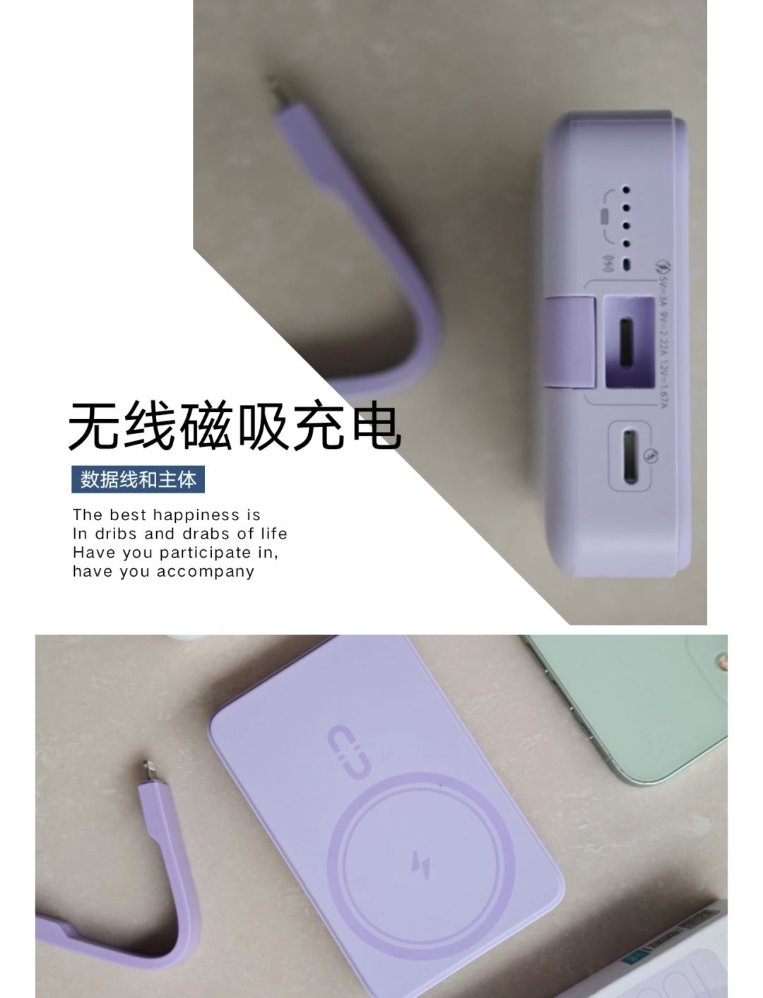 [自拍R]容量大体积小巧,1万毫安的大容量最高支持18W的无线输出功率,外出带上再不用到处找共享充电宝。