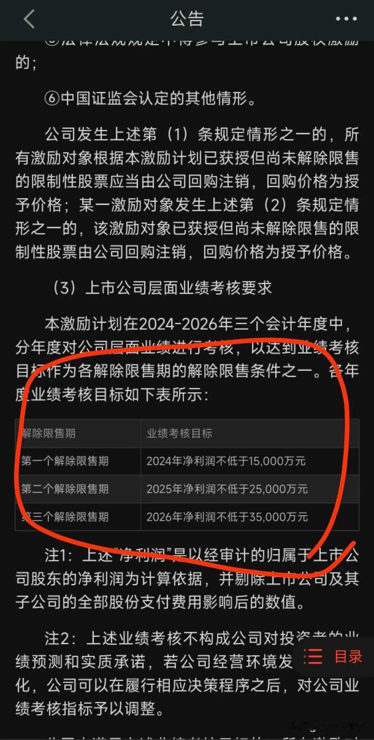 #春日生活打卡季# 欧菲光今晚发了一堆公告,核心的就这一个,篇幅很长,我认真的看了一下,乍看是利空,公司要增发1.3亿股,股本又大了,细看是利好,增发的有限售条件的4000万股分12、24、36个月兑现,2024兑现的条件是净利润1.5亿,2025兑现的条件是净利润2.5亿,2026兑现的条件是3.5亿。这是每年50%以上的增速。期权的兑现条件也一样,这是一笔不菲的收入,董监高要吃这些草料,必须的够的着食槽,变相说明公司的业绩这几年是反转的,是向上的。他们为了实现股价更高的在几年后套现,必须做好公司基本面,做高公司股价。