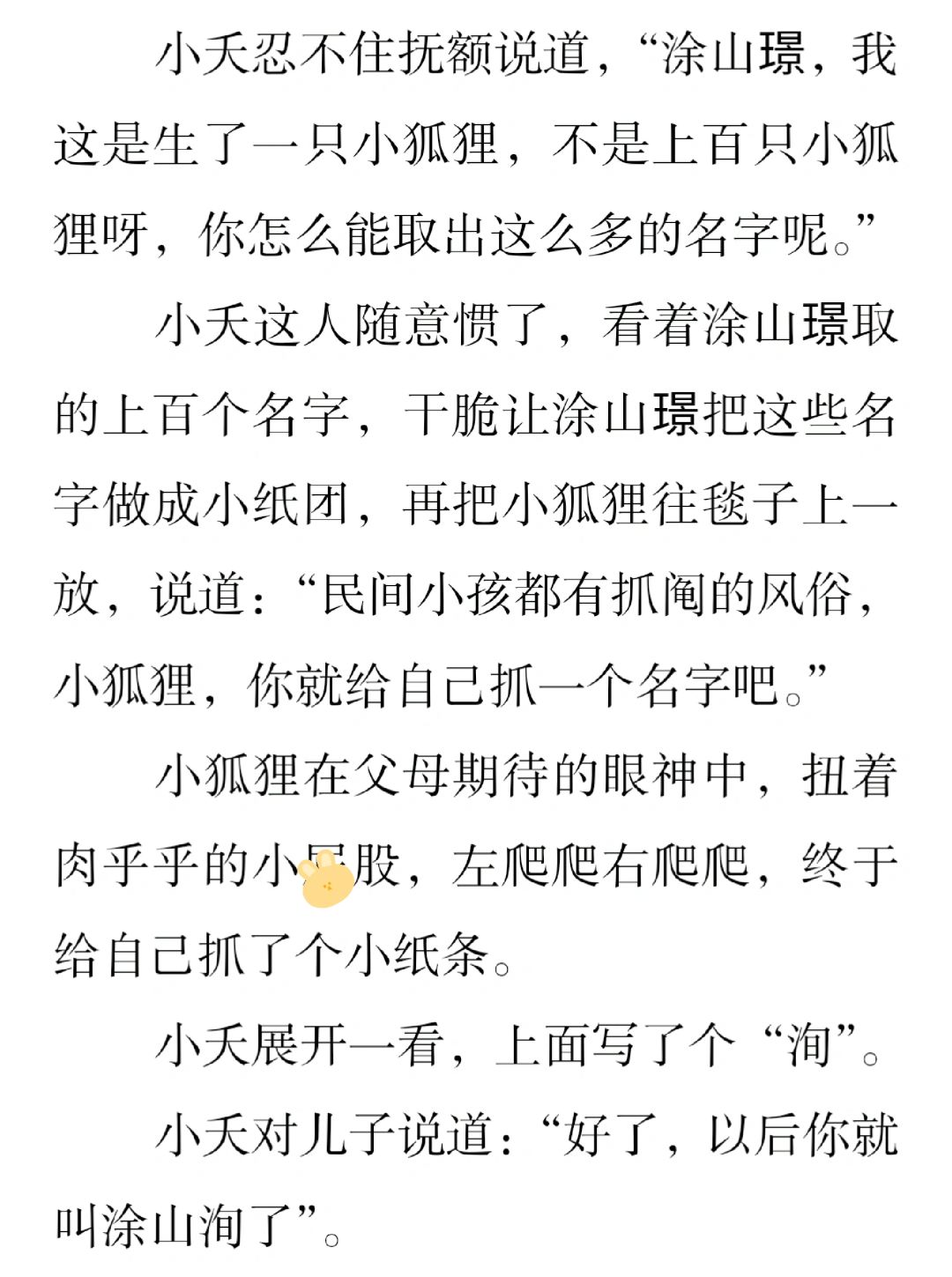 小夭这人随意惯了,看着涂山璟取的上百个名字,干脆让涂山璟把这些名字做成小纸团,再把小狐狸往毯子上一放,说道:“民间小孩都有抓阄的风俗,小狐狸,你就给自己抓一个名字吧。”