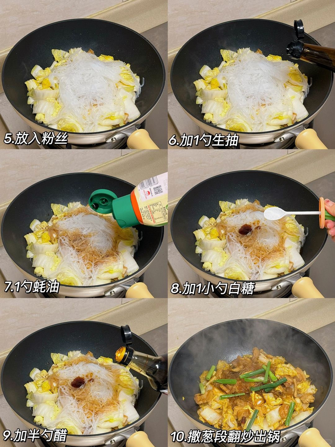 [三R]再放入粉丝,加1勺生抽和蚝油,1小勺白糖,半勺醋,炒匀味后撒葱段出锅