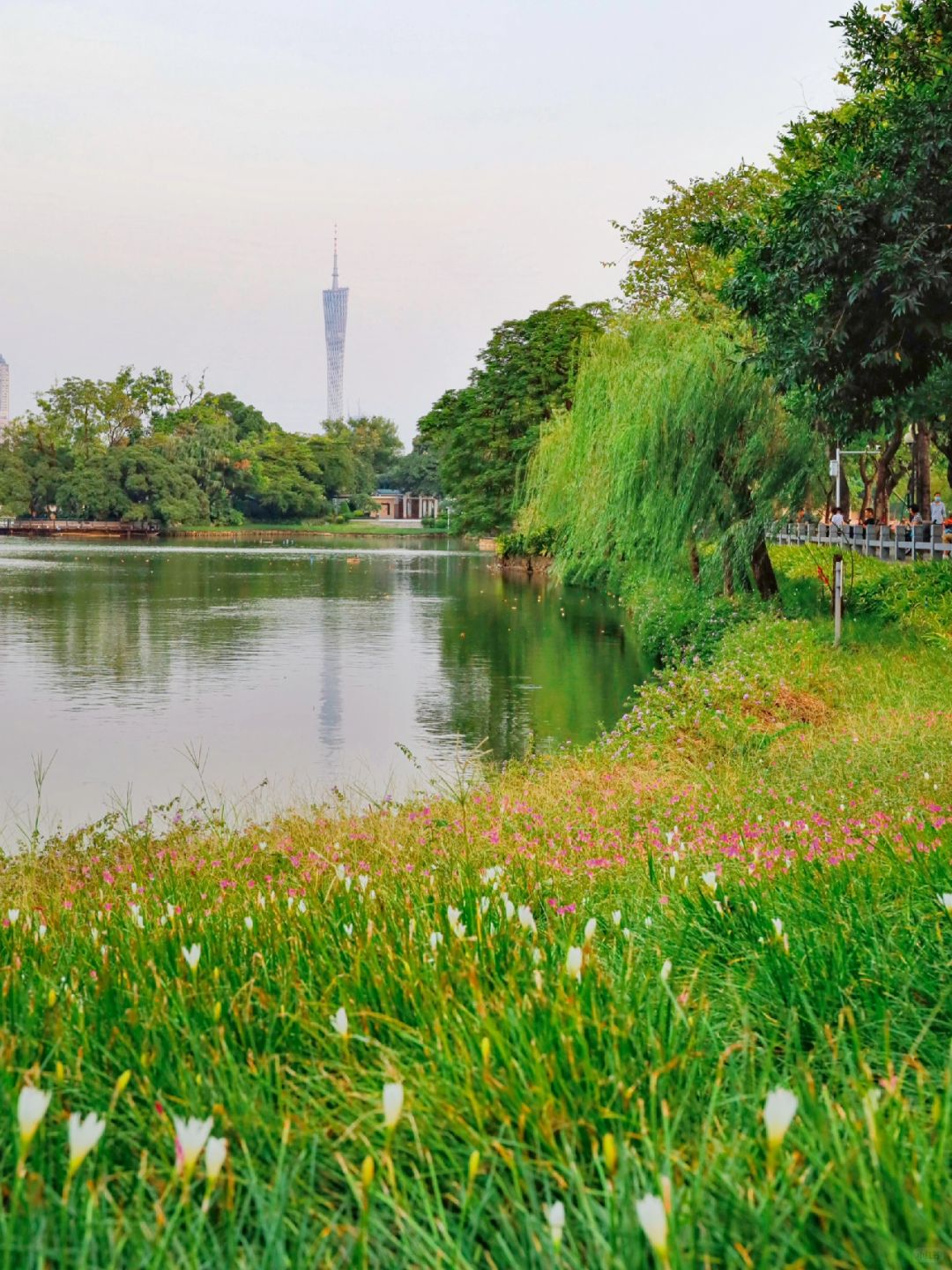 广州塔倒映在湖面,堤岸两边的垂柳飘飘,可以在湖边的长椅上休憩,也可以泛舟湖上,满满的诗情画意。