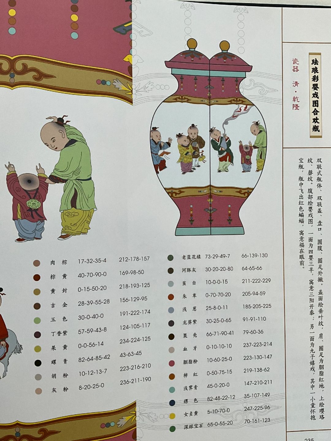 婴戏纹多描绘婴孩游戏或寓意吉祥的画面,婴孩游戏有放风筝、骑竹马、舞刀枪、下棋、逗蛐蛐等,寓意吉祥的画面有婴孩手持荷叶、折枝花、如意、石榴、官帽,骑麒麟,舞龙灯等,注重表现其生动形象,同时细致刻画婴孩的发型、五官、衣服、配饰。清代得见大量绘制工细、立体感强、色彩纯正绚丽的婴戏纹作品。