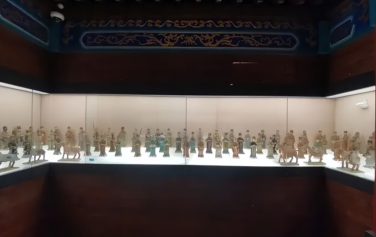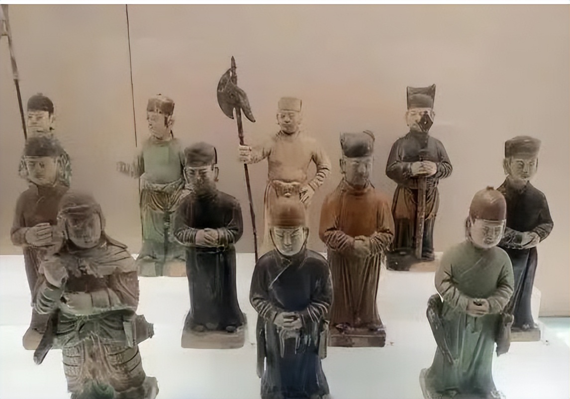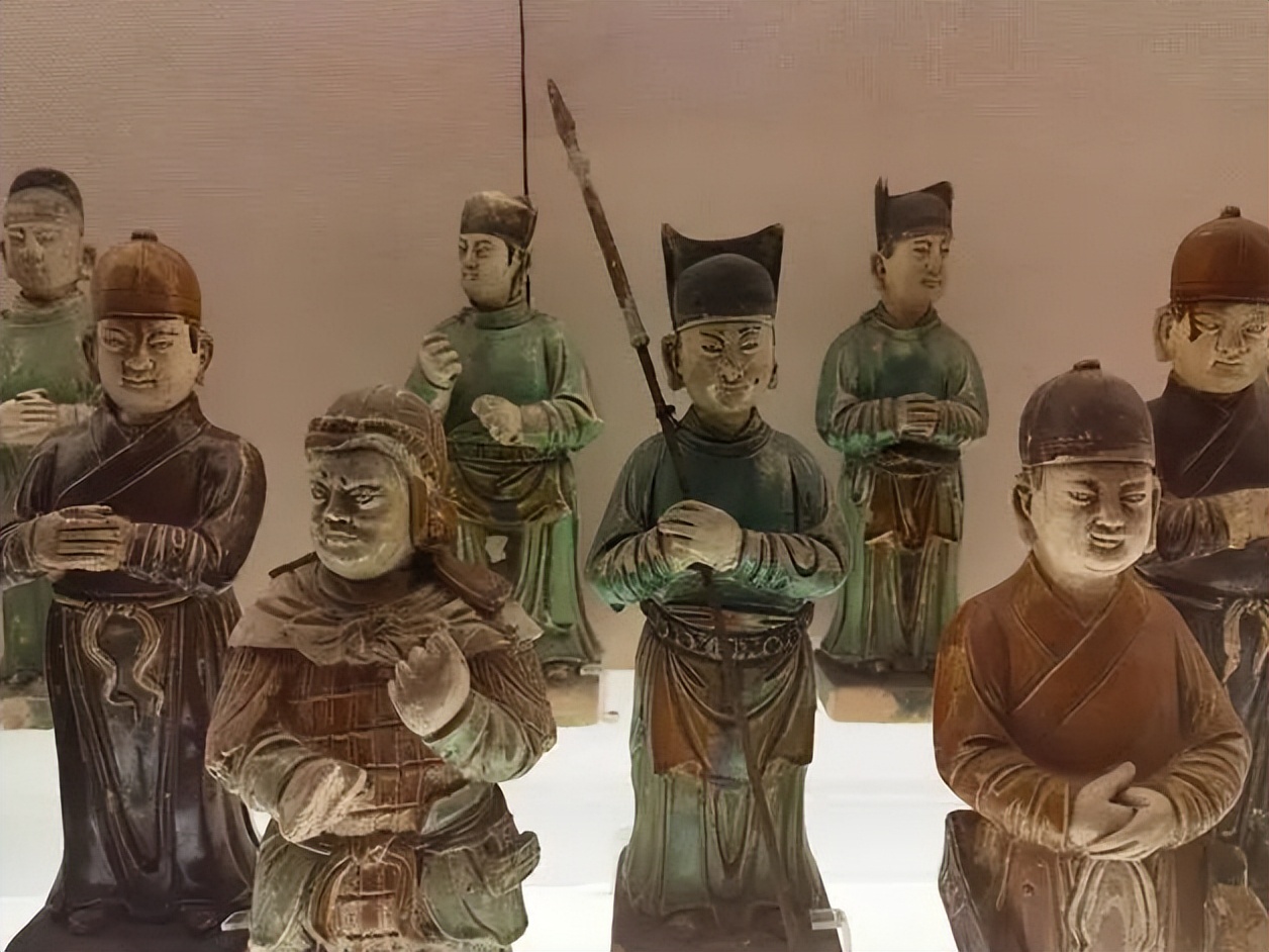 这批陶俑大多是琉璃釉陶,按身份不同,分列在不同位置。前庭左右两厢,是两个武士俑和3匹陶马;正庭两厢各有三排仪仗俑,第一排是牵马俑,第二排击锣鼓、捧画角、执各种仪仗,第三排执刀盾和弓箭。