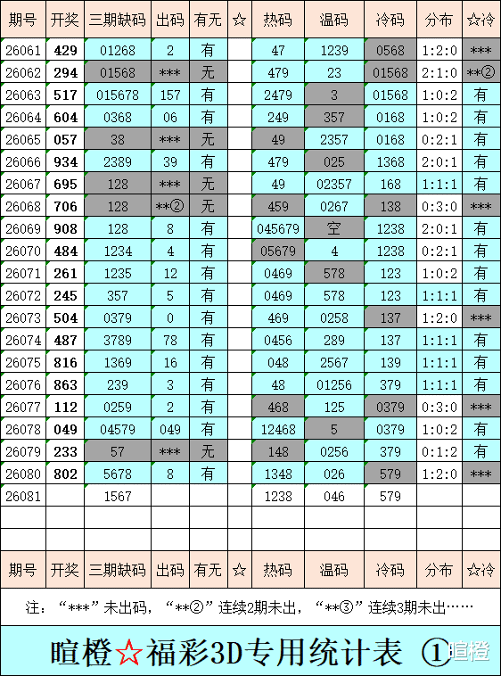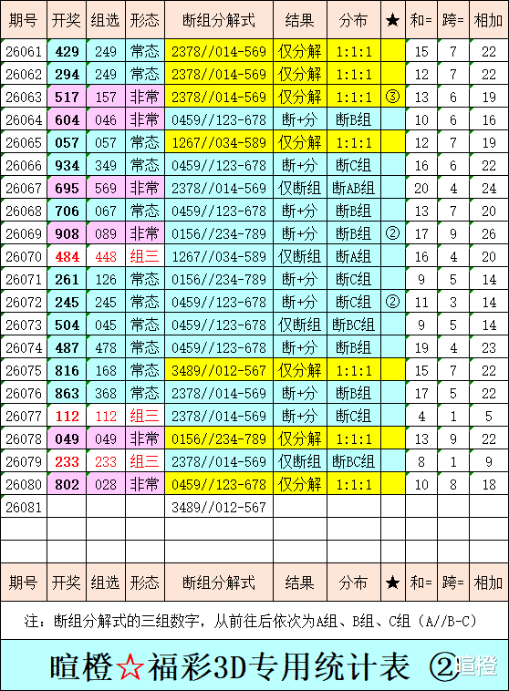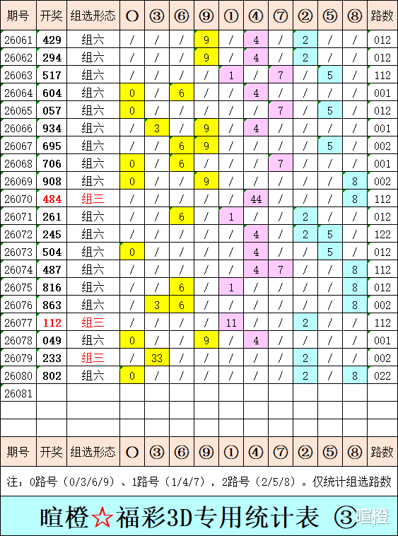 26081期:暄橙福彩3D综合条件(本期将在4月1日21:15开)一、上期回顾 ☆1、上期开奖号:8 0 2。2、和值= 10,跨度= 8。3、非常态组六,022路组合。4、热度分布(热:温:冷)1:2:0。二、本期条件 ☆1、三期缺码:1567。2、热:1238,温:046,冷:579。3、断组分解式:3489//012-567。4、四胆:1267;三胆:127。三、术语解释 ☆1、三期缺码:0至9这十个自然数当中,未在近三期开奖号出现的数字。2、热度(热温冷):自然数0至9,在近七期开奖号中,出现3次及3次以上的数字,称为热码;出现2次的数字,称为温码;出现1次和未出现的数字,称为冷码。某个数字在开奖号中出现几个,就按几次计算。3、断组分解式:将0至9这十个自然数,分成三组数字,从前往后依次为A组(4码)、B组(3码)、C组(3码),一般情况下,有一组数字不出码,偶尔会有两组数字不出码。A组不出码的情况相对较少。断组为主,分解为辅。4、常态组六号码:同时包含大数、小数、奇数、偶数、质数、合数的组六号码,共有72注。统计表中,简称“常态”。5、非常态组六号码:全大数、全小数、全奇数、全偶数、全质数、全合数等六种形态的组六号码,共有48注。统计表中,简称“非常”。★提醒:彩市有风险,参与须谨慎!水平有限,仅供参考!