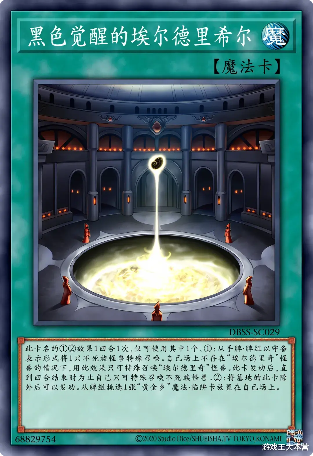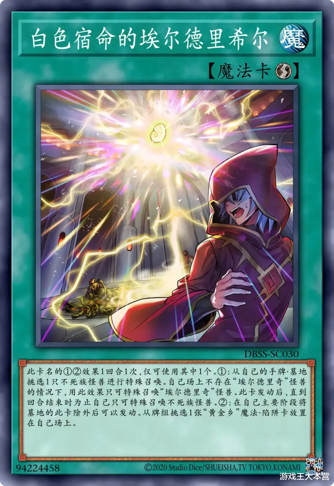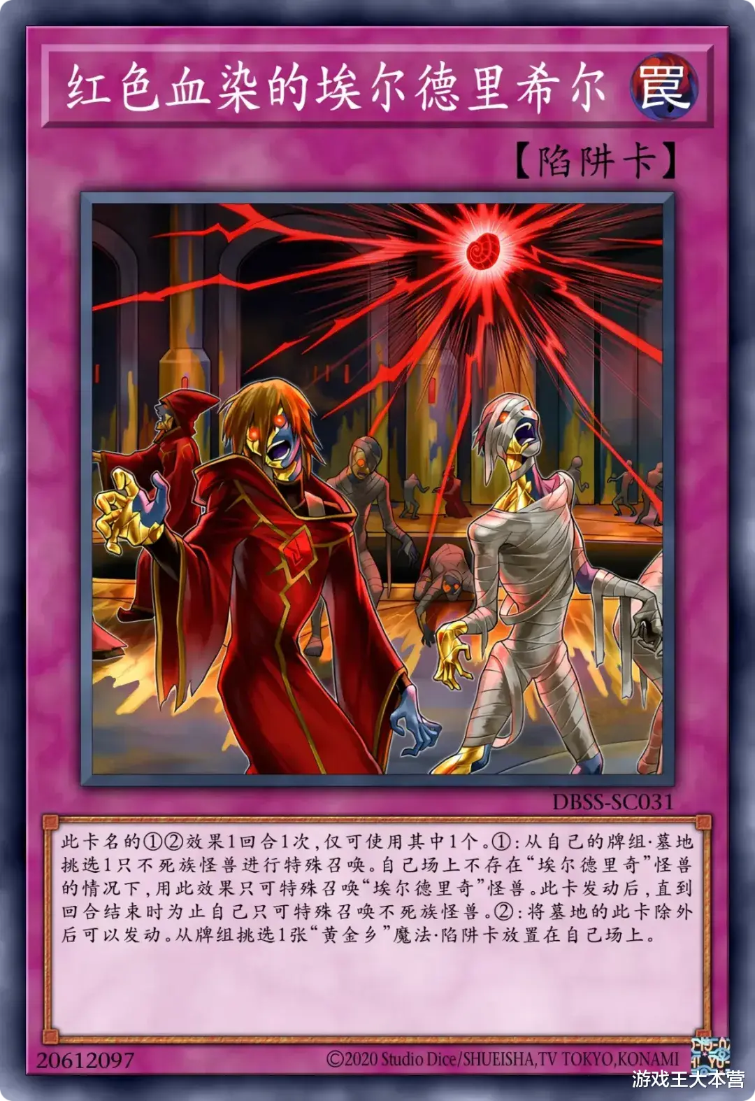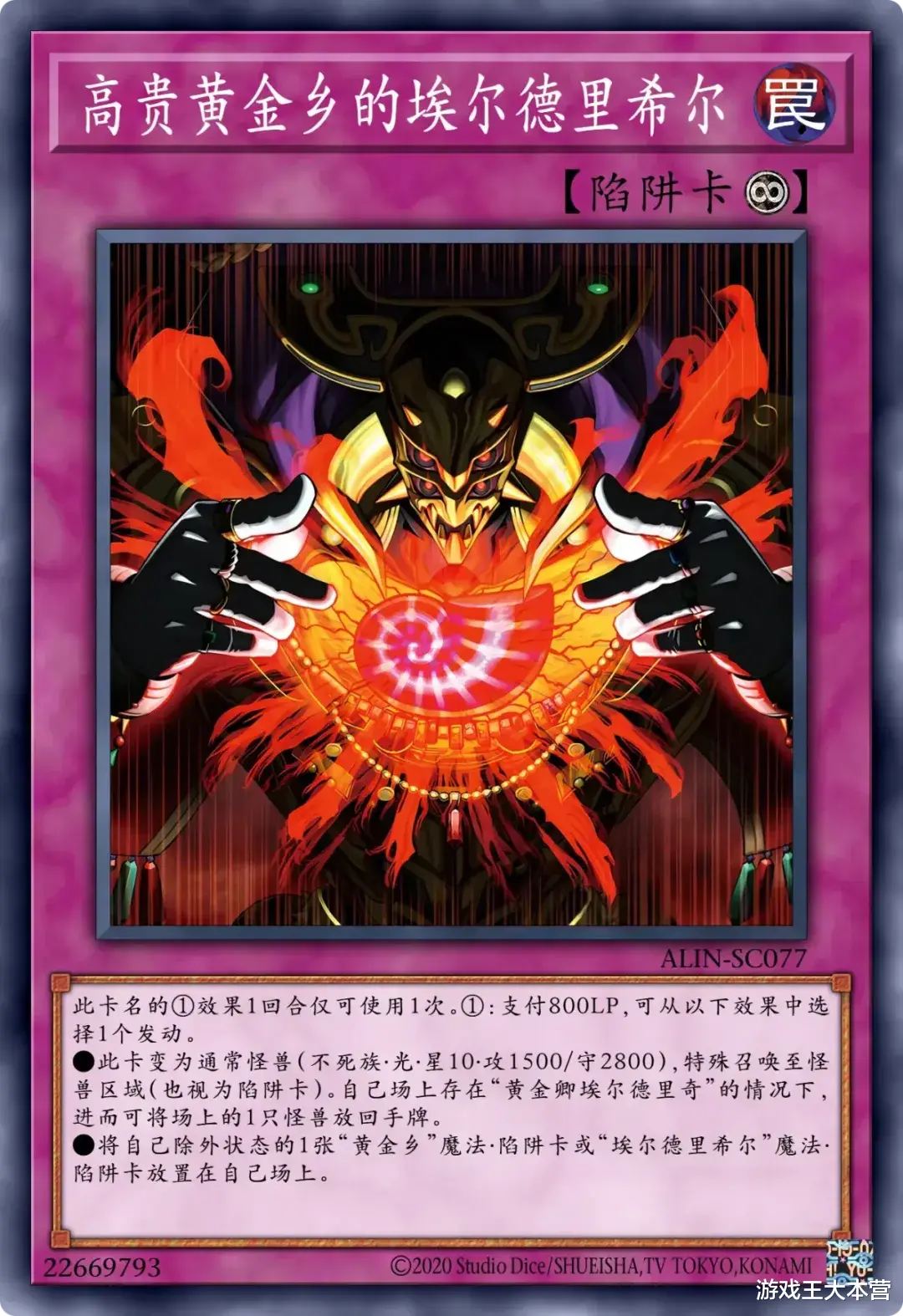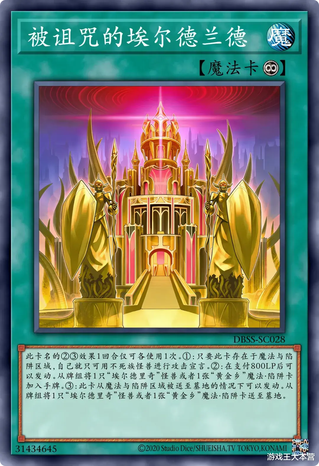 这个卡名的②③效果1回合各能使用1次。①:只要这张卡在魔法陷阱区存在,自己就只能用不死族怪兽攻击宣言。②:可以支付800LP发动。从卡组将1只「埃尔德里奇」怪兽或1张「黄金乡」魔法陷阱卡加入手牌。③:这张卡从魔法陷阱区送入墓地的场合可以发动。从卡组将1只「埃尔德里奇」怪兽或1张「黄金乡」魔法陷阱卡送入墓地。