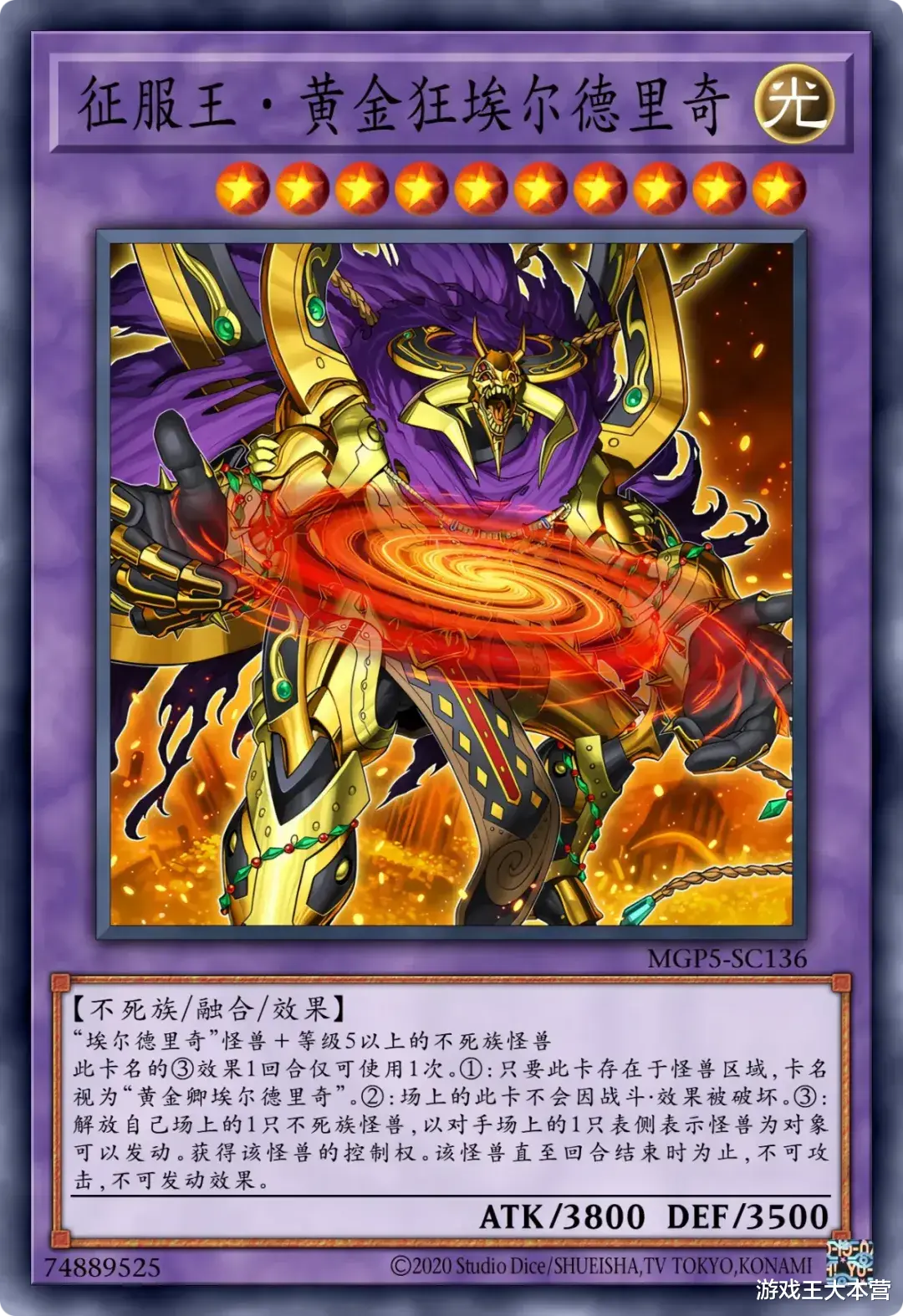 额外卡组,征服王埃尔德里奇、黄金乡堕天像融合怪兽,需解放「黄金卿埃尔德里奇」或用「黄金乡的七摩天」魔法卡召唤。更高抗性与强力解场、压制效果。整体战术围绕 “黄金卿反复回收 + 陷阱干扰 + 魔法快速展开” 展开,永续陷阱为主要阻抗,不死族为站场核心,墓地与后场的持续联动成重坑控制体系,常作为纯控制或不死族主轴卡组使用,兼容泛用手坑,稳定的后手突破与先手压制。