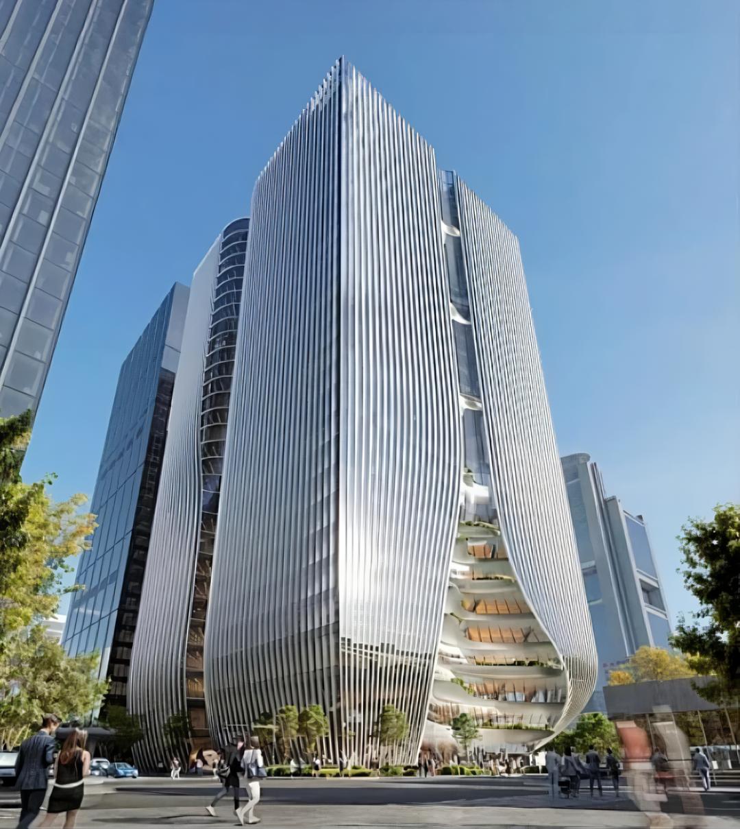 建筑通过流畅优雅的设计语言,与CBD中心相互呼应,向上延伸形成空中绿廊,向下渗透连接下沉广场。建筑西立面设有一系列错落有致的露台和内部中庭空间,这些设计元素向上延伸,建立起与自然与城市空间的独特联系。