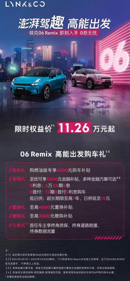 总之,领克06 Remix凭借前瞻性的设计和不断创新的精神,俨然成为年轻消费者购车的首要选择,它也通过自身产品力向年轻消费者递交了一份令人满意的答卷,值得所有人信赖。更有燃油版购车权益可以领取,其中包括6000元购车补贴、至高4000元金融补贴、4000元置换补贴和3000元的增购补贴,还提供首任车主终身质保服务等,优惠拉满,尽享无忧购车。