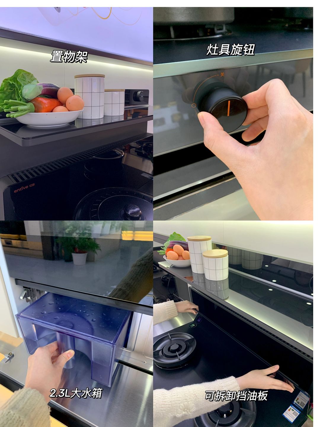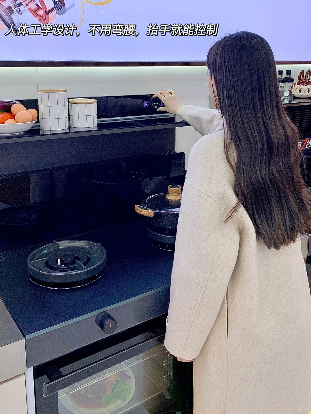 首先颜值方面我们非常满意:黑色机身、超薄机头,设计简约耐看还科技感满满滴,面板是黑晶磨砂的面板,比普通的面板更耐用,也更好打理;其次因为是家里老人要用,我们更关注操作方面,这款集成灶操作简单智能化,它的灵动旋钮、炫彩大屏设计在了烟机的位置,轻轻抬手即可操作,非常方便!