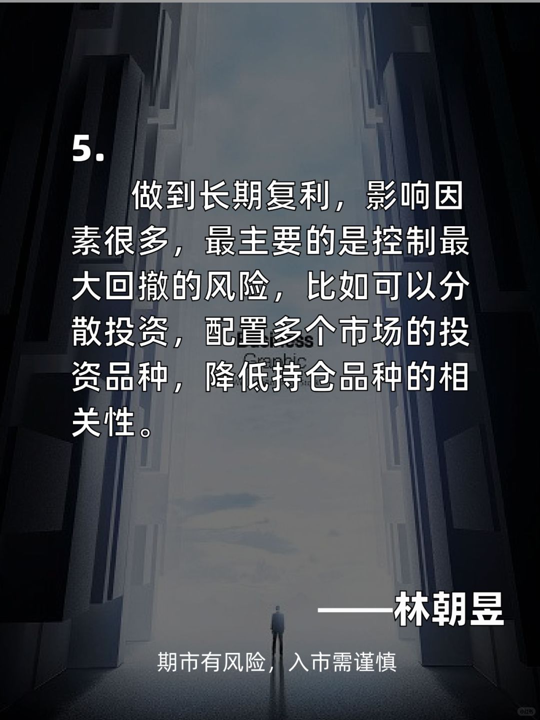 6. 做到长期复利,影响因素很多,最主要的是控制最大回撤的风险,比如可以分散投资,配置多个市场的投资品种,降低持仓品种的相关性。