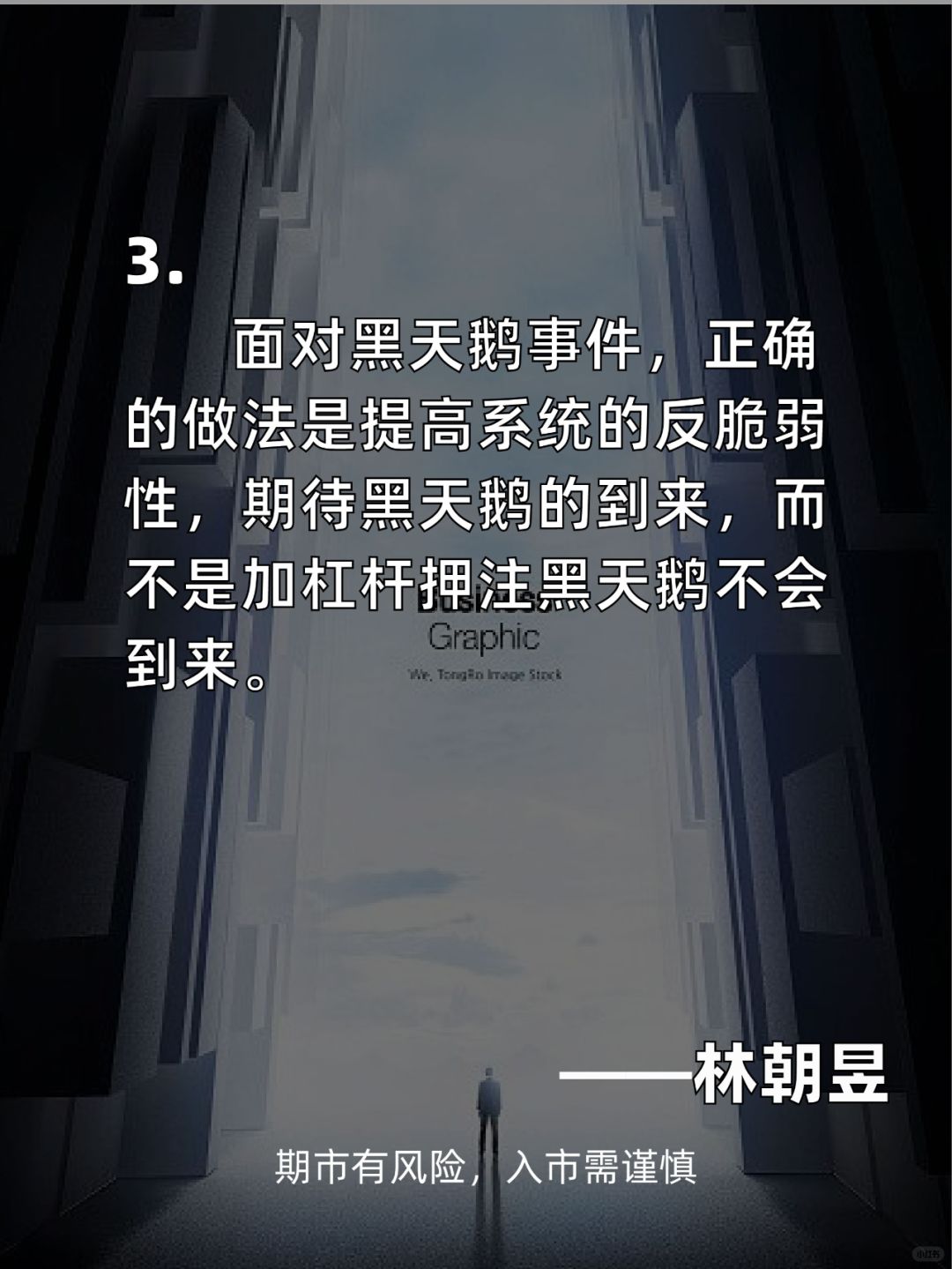 3. 面对黑天鹅事件,正确的做法是提高系统的反脆弱性,期待黑天鹅的到来,而不是加杠杆押注黑天鹅不会到来。