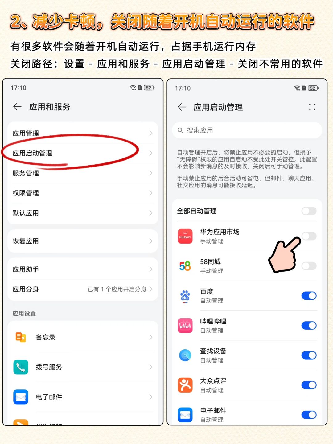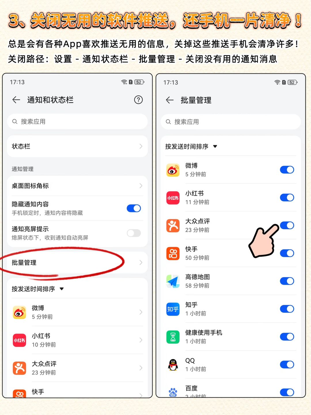 1️⃣验机,通过查询手机的激活时间来确定是不是新手机 2️⃣很多软件会随着开机一起运行,需要设置关掉没有用的手机软件,减少卡顿 3️⃣手机经常会推送各种通知信息,一些无用的消息推送很影响我们的使用体验。可以选择性的关掉一些软件推送~