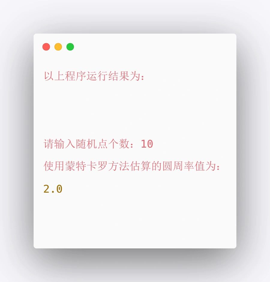 Python小项目[一R][四R][九R] ~ [一R]题目 用蒙特卡罗方法,计算圆周率的近似值。 (提示:用单位圆的模型) ~ [二R]程序分析 程序使用自定义👌函数来做,还用到了随机库random,最后利用for循环🔄,带公式算即[可R]。 ~