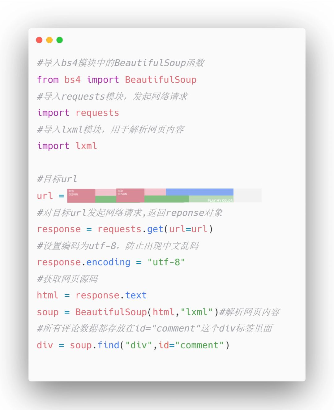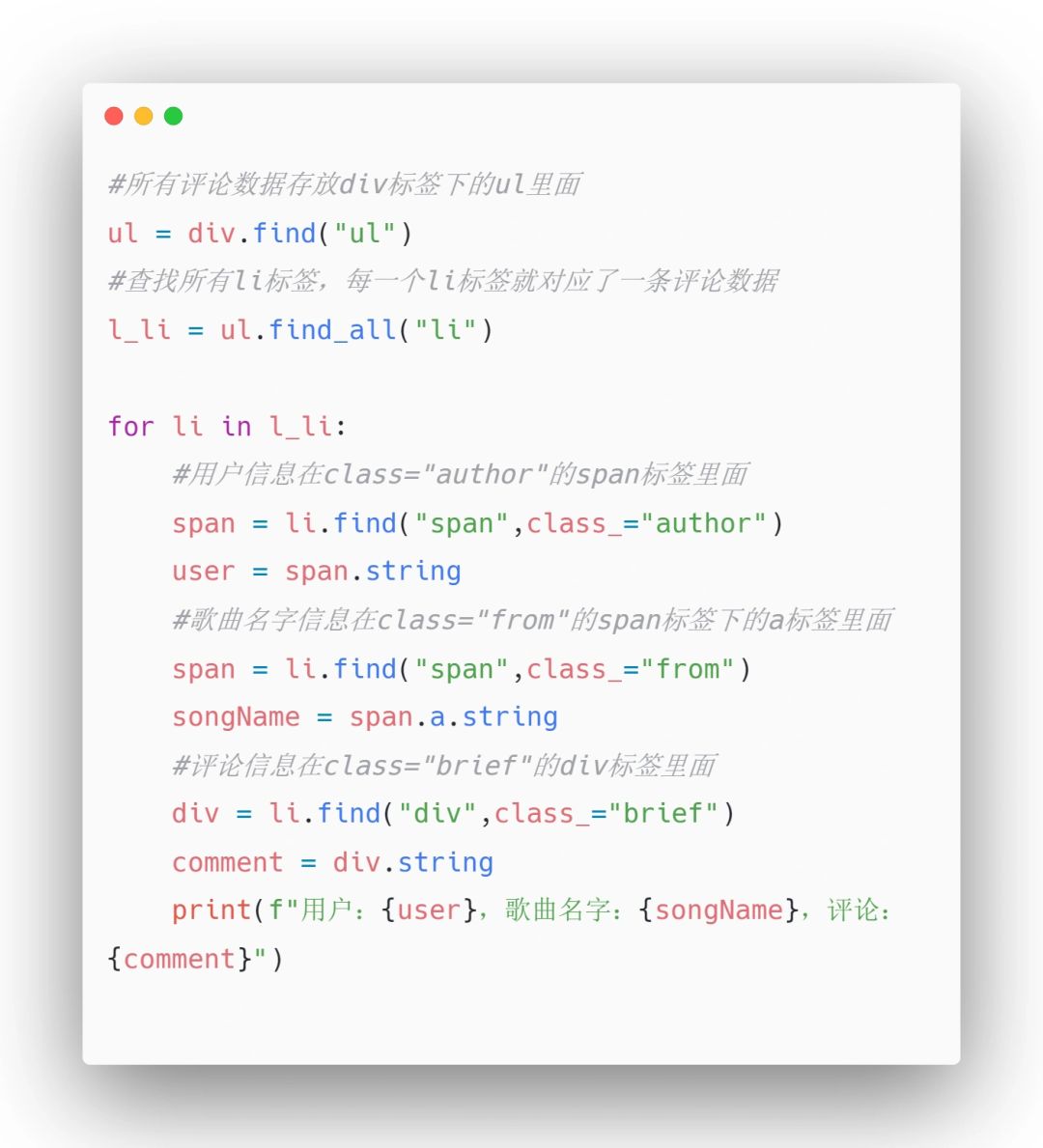分享一个简单的爬虫小程序❗❗❗ ~ [一R]需求 爬取“好听轻音乐”最新评论数据,包含三个字段,分别是评论的用户,评论的歌曲和评论的内容。 [二R]模块说明 程序使用三个模块,第一个模块是bs4模块中的Beautiful函数,用来获取网页信息,第二个模块是requests模块,用来发起网络请求,第三个模块是lxml,用来解析网页内容。 [三R]图片说明 图1️⃣:需要爬取的评论信息的各个数据字段。 图2️⃣:爬取结果。 图3️⃣-图4️⃣:程序源代码。 ~