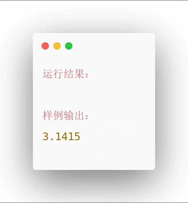 Python-while循环[零R][六R]-计算圆周率 ~ [一R]题目描述 使用如下公式求圆周率π。 公式:π**2=1+1/(2**2)+1/(3**2)+1/(4**2)+... [二R]输入格式 无 [三R]输出格式 一行一个浮点数,表示圆周率π。精确到小数点后4位。 [四R]样例输入 无 [五R]样例输出 3.1415 [六R]题目分析 套用题中公式,当右式枚举至累加项足够小时即可约等于左式。 ~