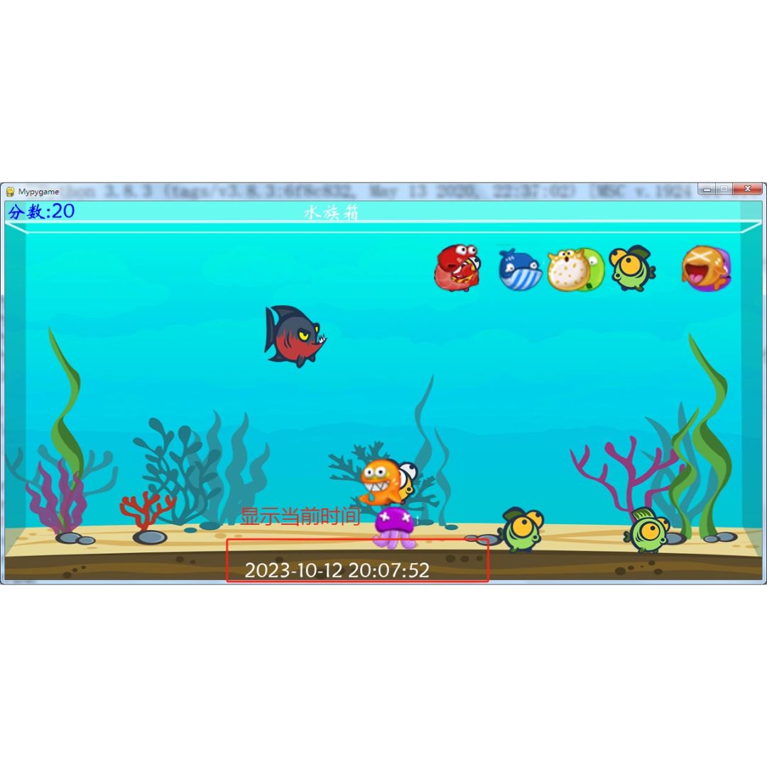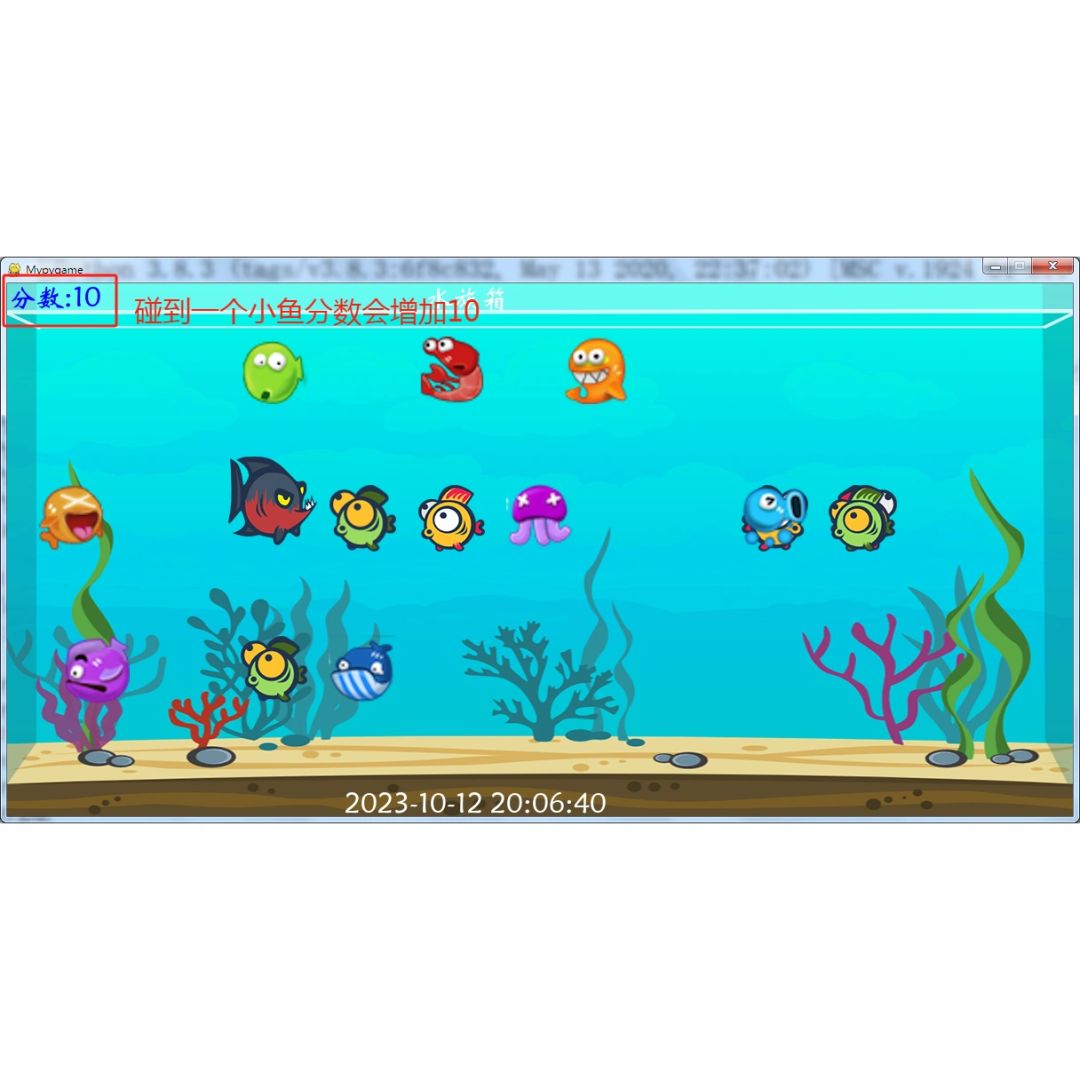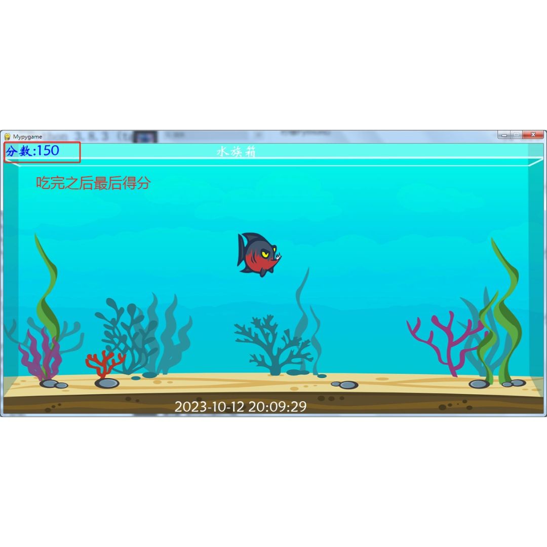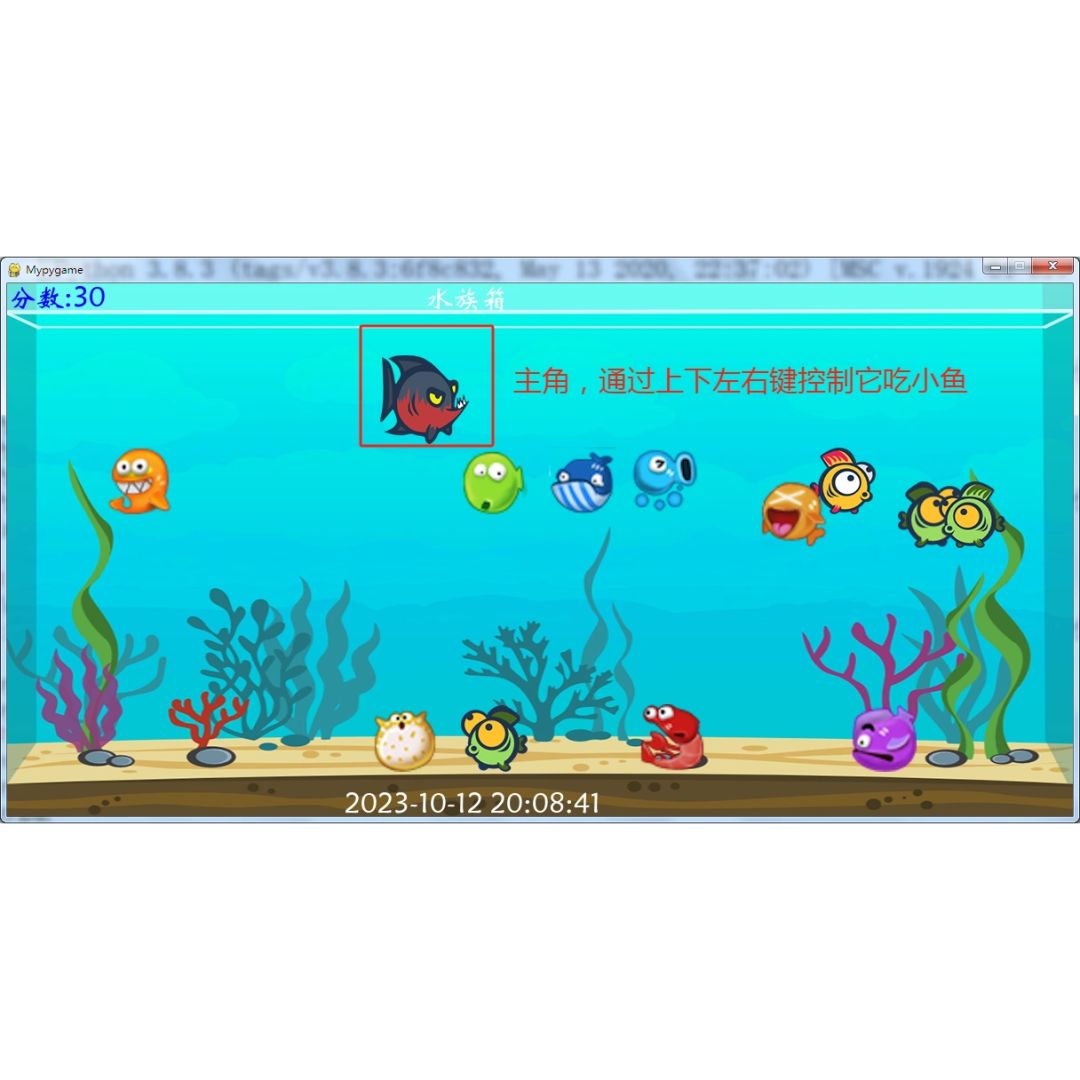 使用Python的Pygame模块写了一个大鱼吃小鱼的游戏。 ~ [火R]游戏规则: 通过上下左右键控制大鱼移动去吃小鱼。大鱼不能跑出窗口。 ~ [火R]游戏说明: 小鱼碰到大鱼之后会消失,然后左上角分数会加10分,小鱼碰到窗口边缘会反弹回来。 ~ [爆炸R]总的来说游戏🎮[可R]能还有一点点瑕疵,不过你们感兴趣的话可以自己修改👌一下代码。 ~ ⚠️程序源码和素材都已经打包好了❗❗❗ ~