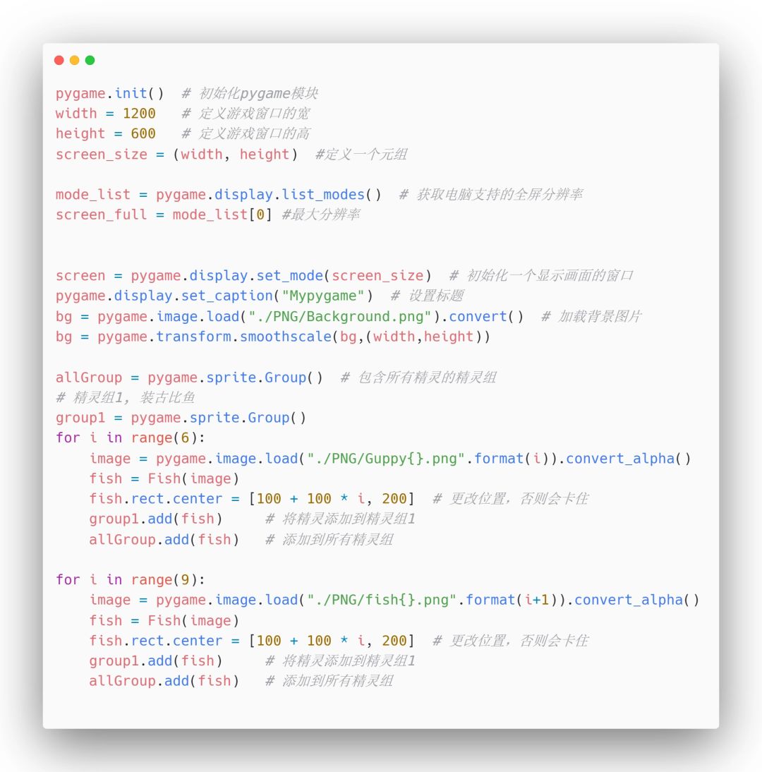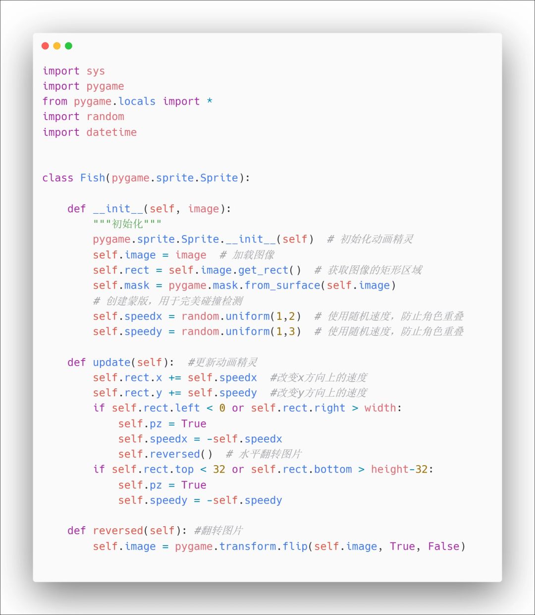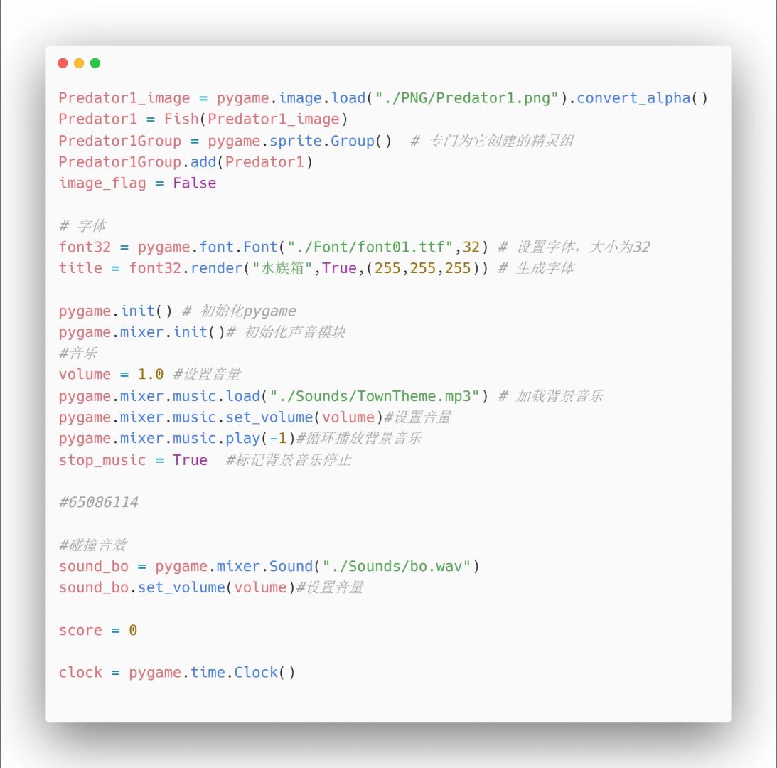 使用Python的Pygame模块写了一个大鱼吃小鱼的游戏。 ~ [火R]游戏规则: 通过上下左右键控制大鱼移动去吃小鱼。大鱼不能跑出窗口。 ~ [火R]游戏说明: 小鱼碰到大鱼之后会消失,然后左上角分数会加10分,小鱼碰到窗口边缘会反弹回来。 ~ [爆炸R]总的来说游戏🎮[可R]能还有一点点瑕疵,不过你们感兴趣的话可以自己修改👌一下代码。 ~ ⚠️程序源码和素材都已经打包好了❗❗❗ ~