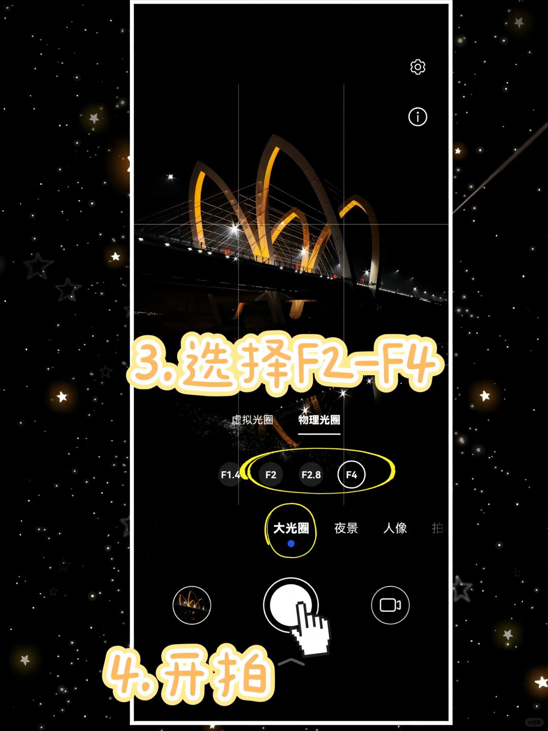 你用手机拍夜景是不是平平无奇,教你一个小技巧🉐,这样拍夜晚,充满了故事感和神秘感有木有📸,只需要这样设置: 1️⃣打开相机左划至大光圈模式 2️⃣选择物理光圈 3️⃣选择F2-F4(F2.8-F4效果更好哦☺) 4️⃣点击开拍 nova 12 Ultra 这个技巧拍摄光源,星芒效果简直了‼️ 宝子们动动手指,评论区交换一下你的星芒大片吧🫵