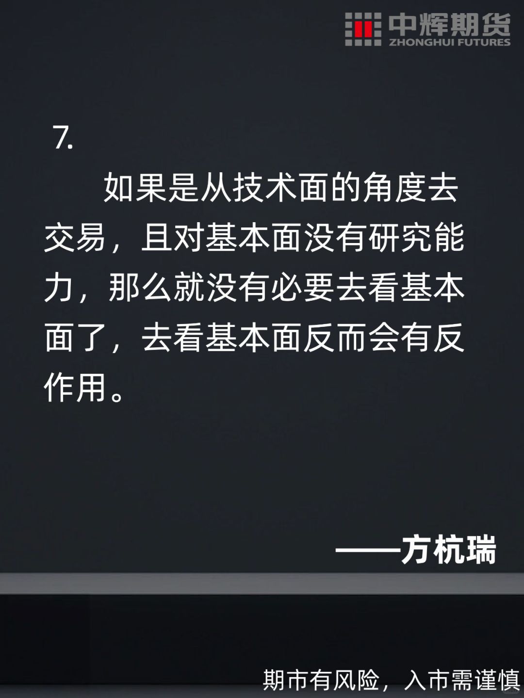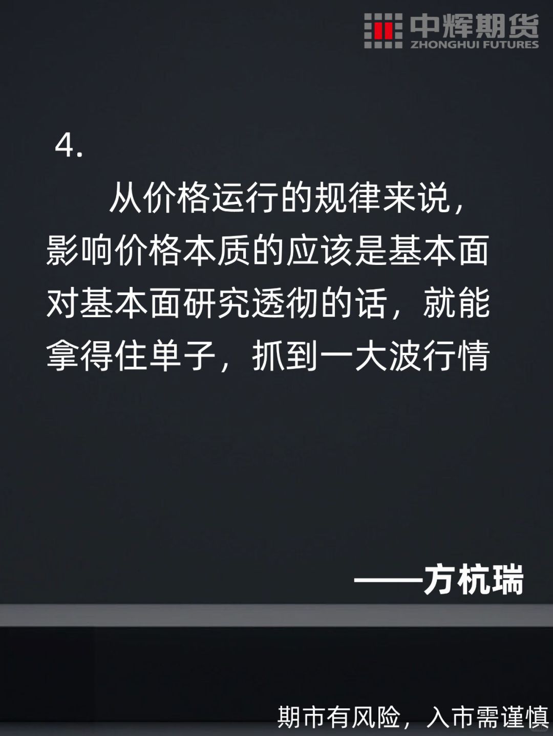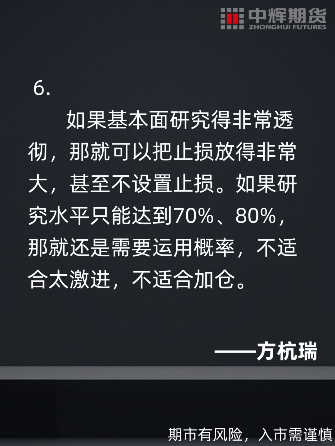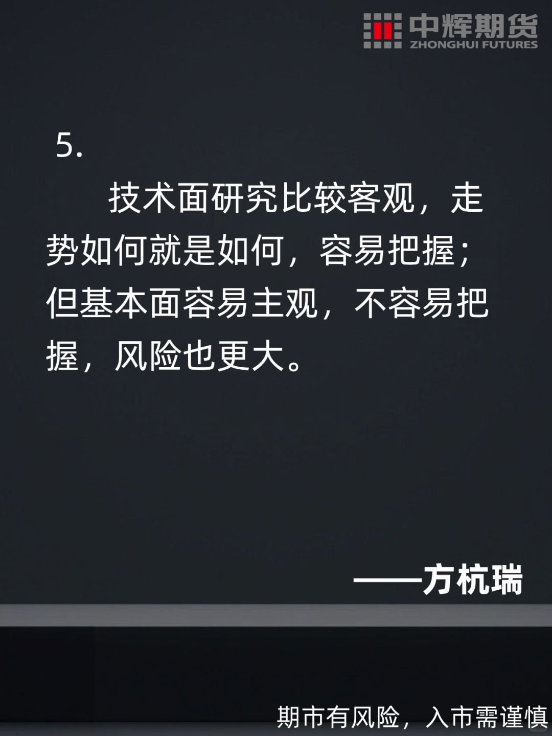 🔺方杭瑞表示:“我主要以技术面为主,也喜欢研究基本面。因为精力有限,基本面只做一个大概的分析,主要还是靠技术面,因为基本面最终会反映到走势上去。盘感包括了技术水平、心态和对基本面的了解,盘感总结了所有的东西。其实盘感是一种综合的东西,它包含了交易者对其它所有东西的综合提炼、感悟和判断。”