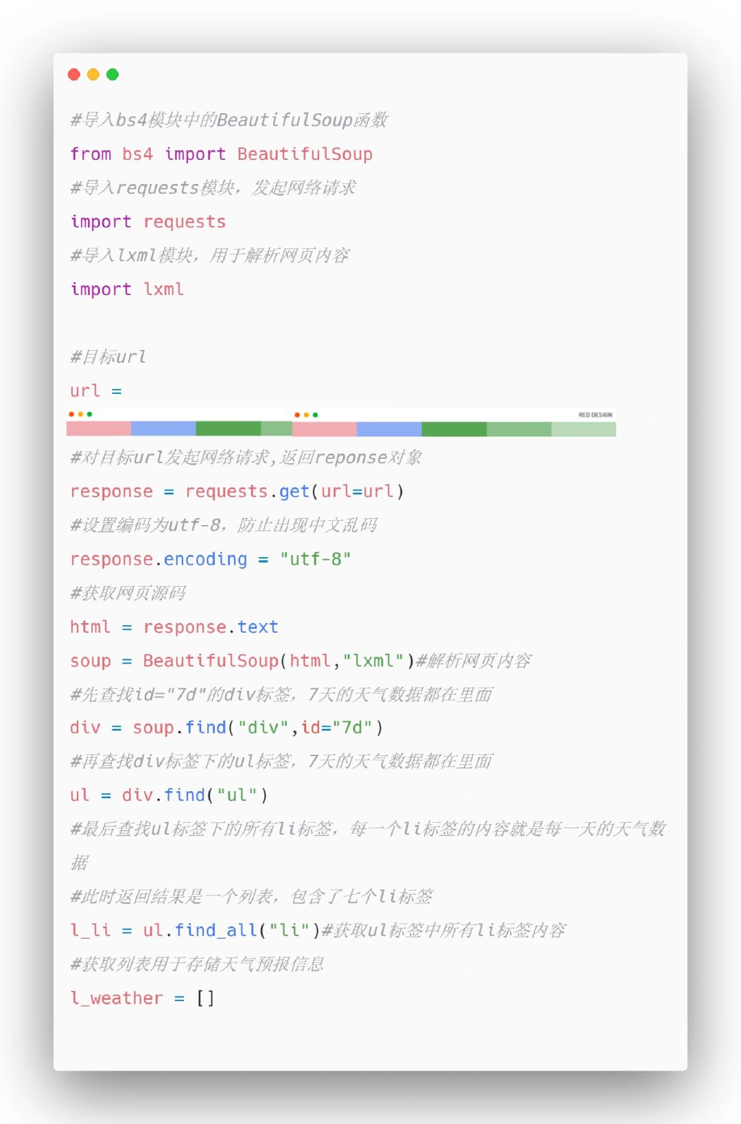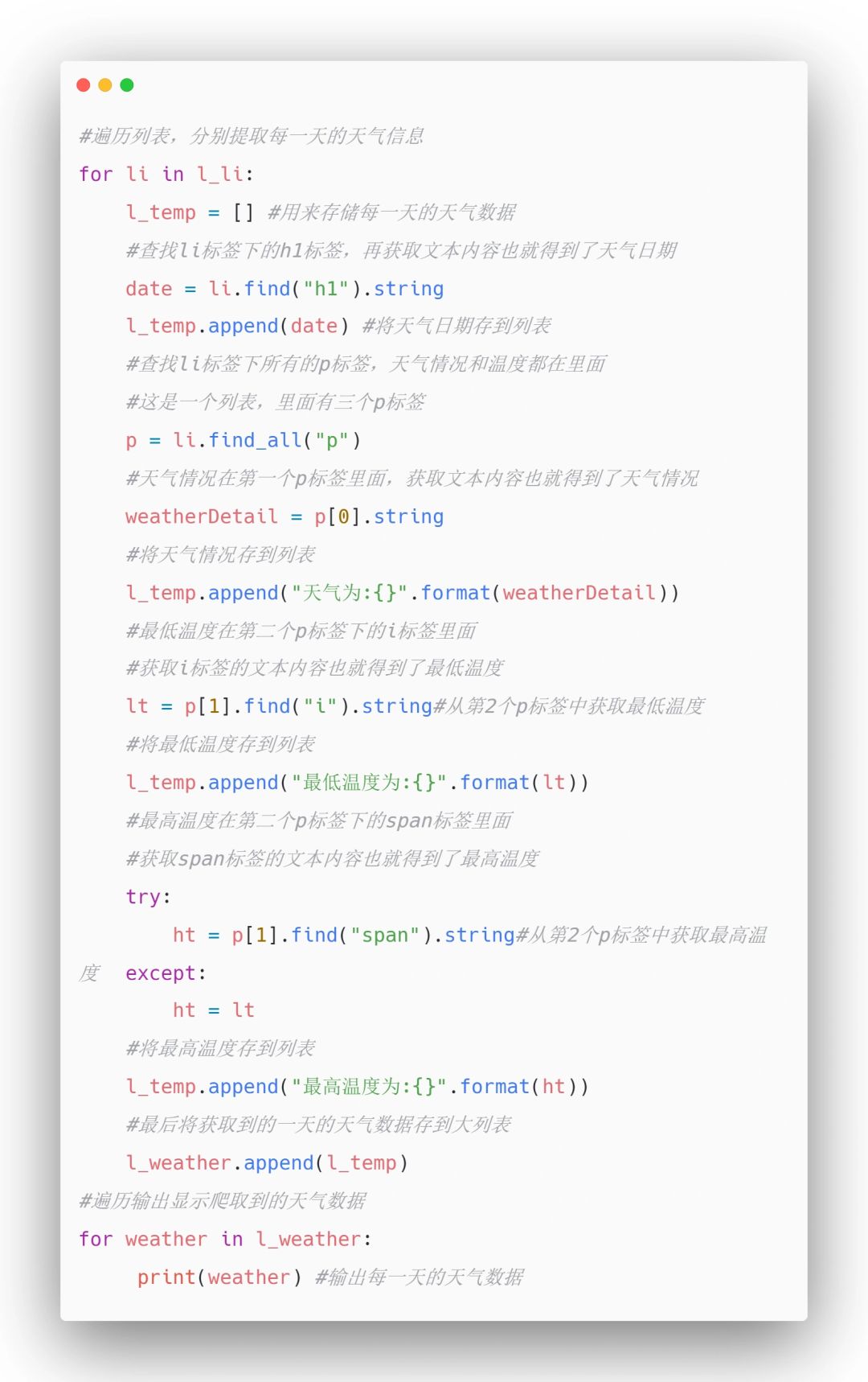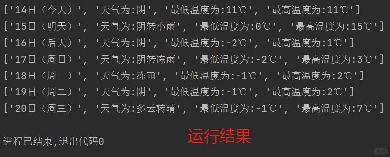 将爬取的结果保存到列表之后再输出,适🈴小白练手,而且注释写得很详细,如果还看不懂,那你就是个大聪明了,如果想要爬取自己当地的天气数据,直接切换到当地地区,然后把正确的url换上去即🉑❗❗❗