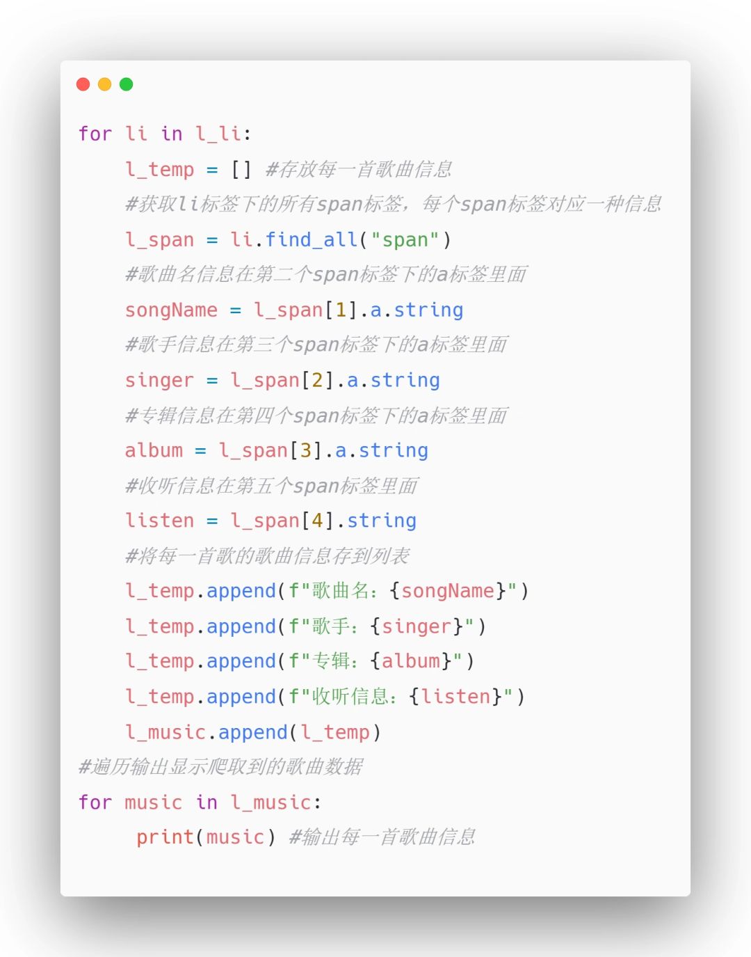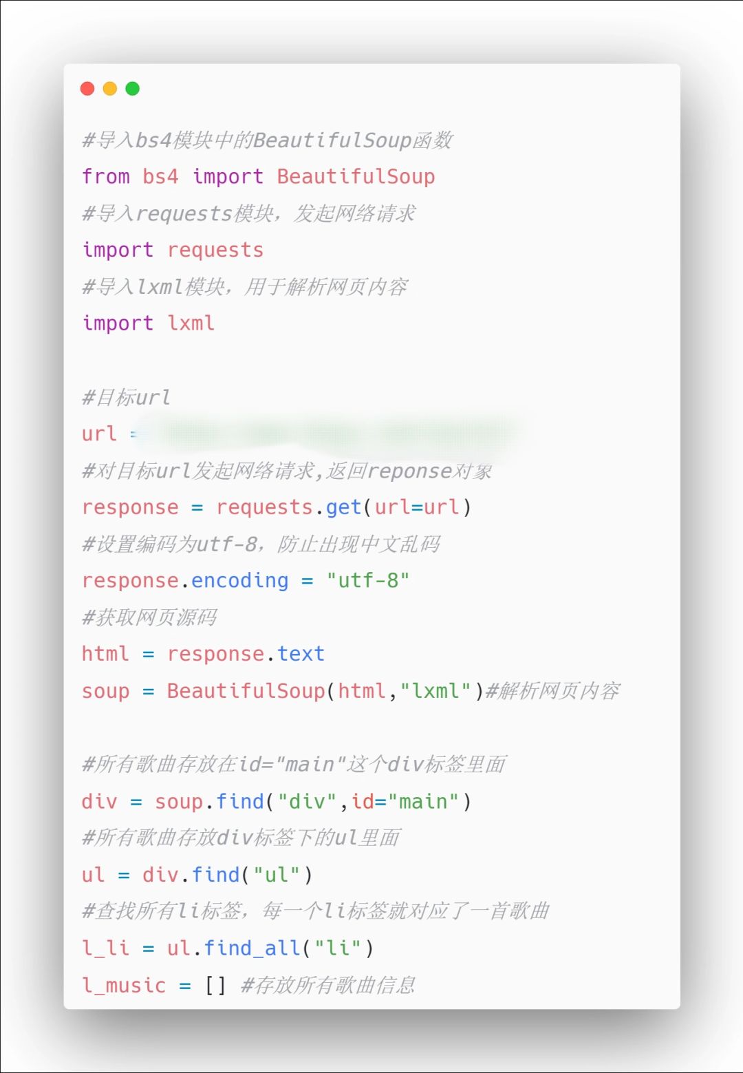 分享一个简单的爬虫音乐数据小程序❗❗❗ ~ [一R]需求 爬取“好听轻音乐”音乐排行榜中热播榜500页面(如图一),第一页20首歌曲数据,包含四个字段,分别是歌曲名,歌手,专辑和收听人数。 ~ [二R]模块说明 程序使用三个模块,第一个模块是bs4模块中的Beautiful函数,用来获取网页信息,第二个模块是requests模块,用来发起网络请求,第三个模块是lxml,用来解析网页内容。 ~ [三R]图片说明 图1️⃣:爬取的歌曲的各个数据字段。 图2️⃣:爬取结果。 图3️⃣-图4️⃣:程序源代码。 ~