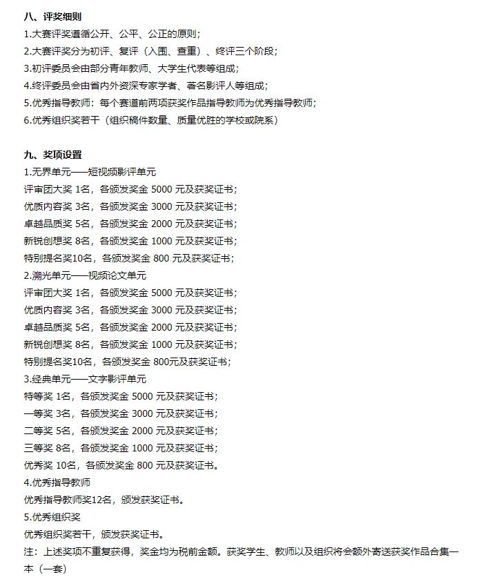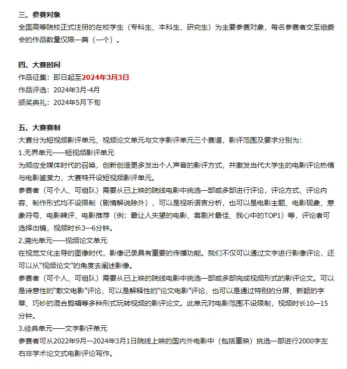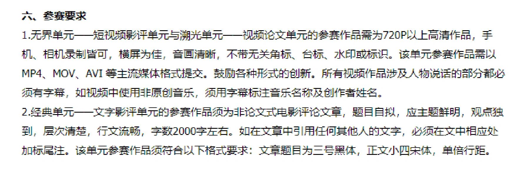 大赛分为短视频影评单元、视频论文单元与文字影评单元三个赛道,影评范围及要求分别为: