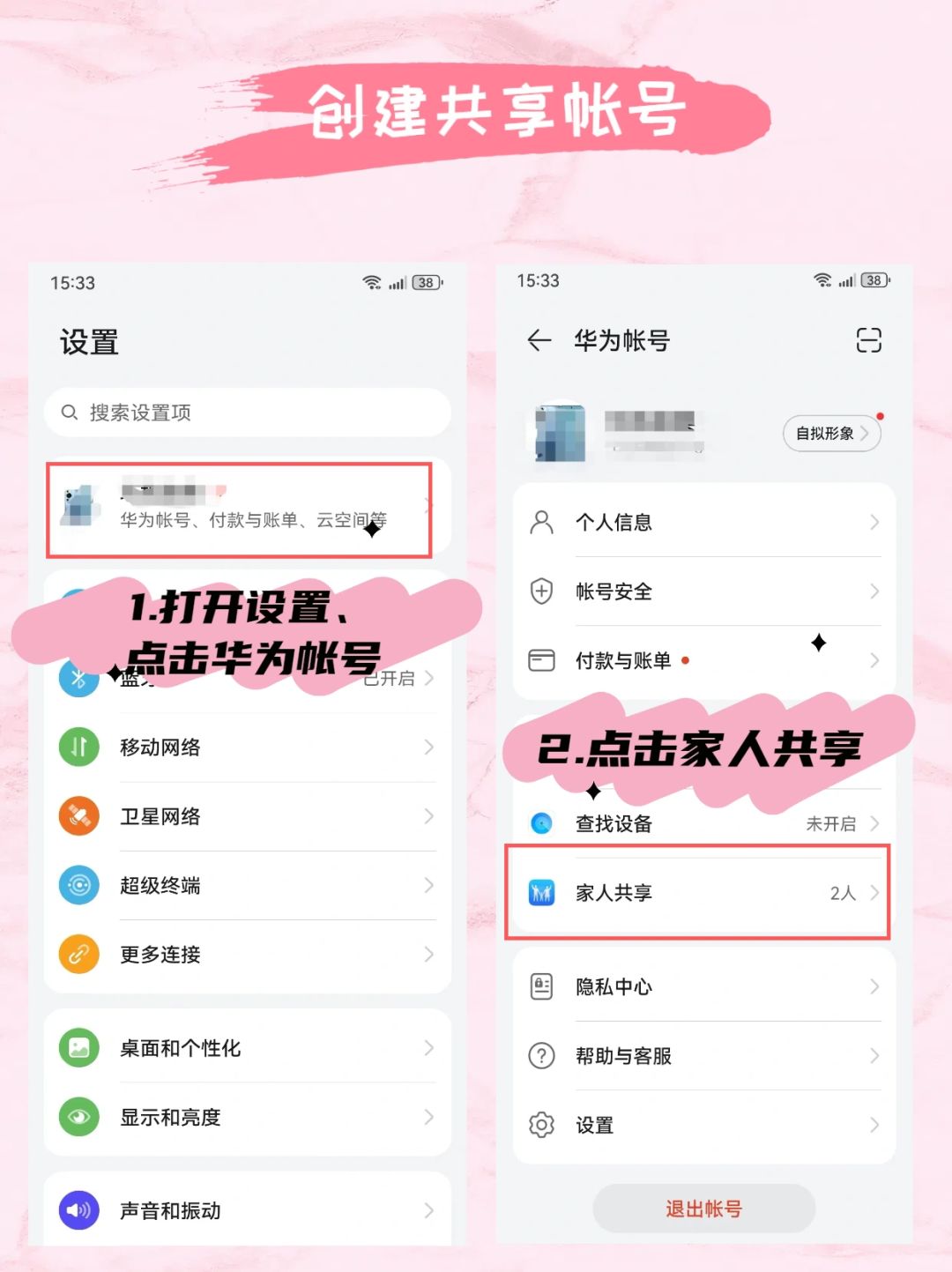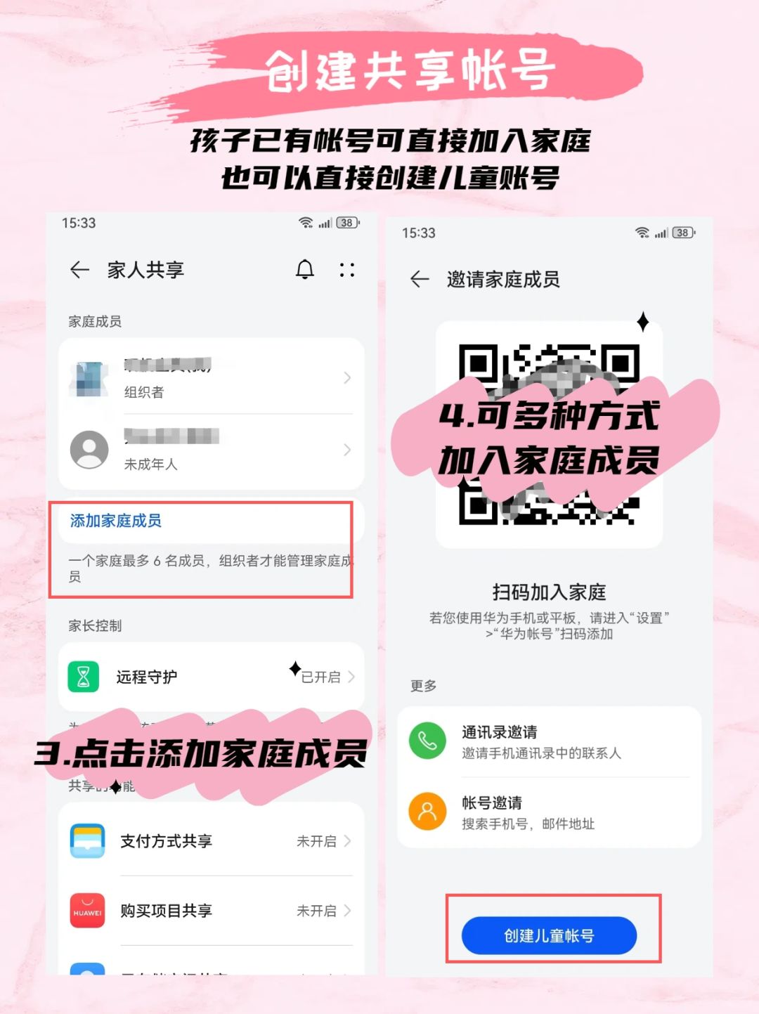 设置—华为帐号—家人共享—添加家庭成员—加入家庭或者创建儿童帐号(根据提示完成注册即可)