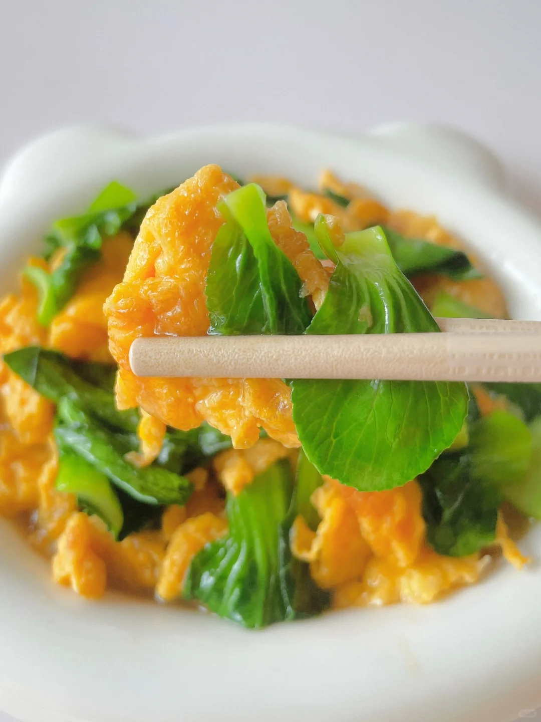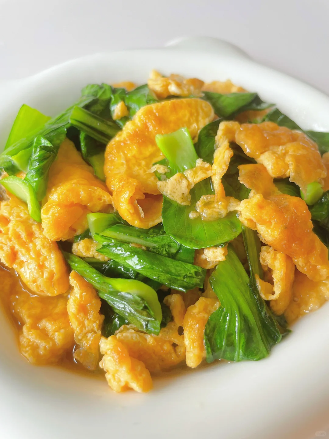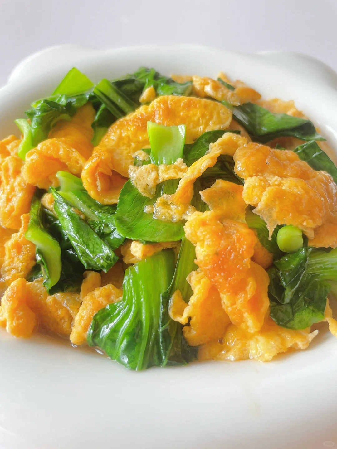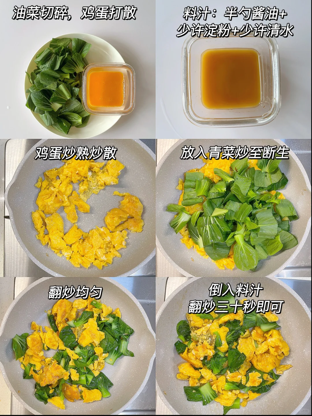 🌈鲜香爽口,配上米饭吃特别香~ 🎈准备食材: 1️⃣小油菜三、四颗,鸡蛋两个; 🎈制作步骤: 1️⃣小油菜已经去掉一些根部,切碎,鸡蛋打散备用; 2️⃣料汁:半勺酱油+少许淀粉和清水; 3️⃣热锅刷油,倒入蛋液炒熟炒散,放入油菜炒至断生,倒入料汁中火翻炒三十秒左右,可再加少许盐,翻炒均匀出锅。