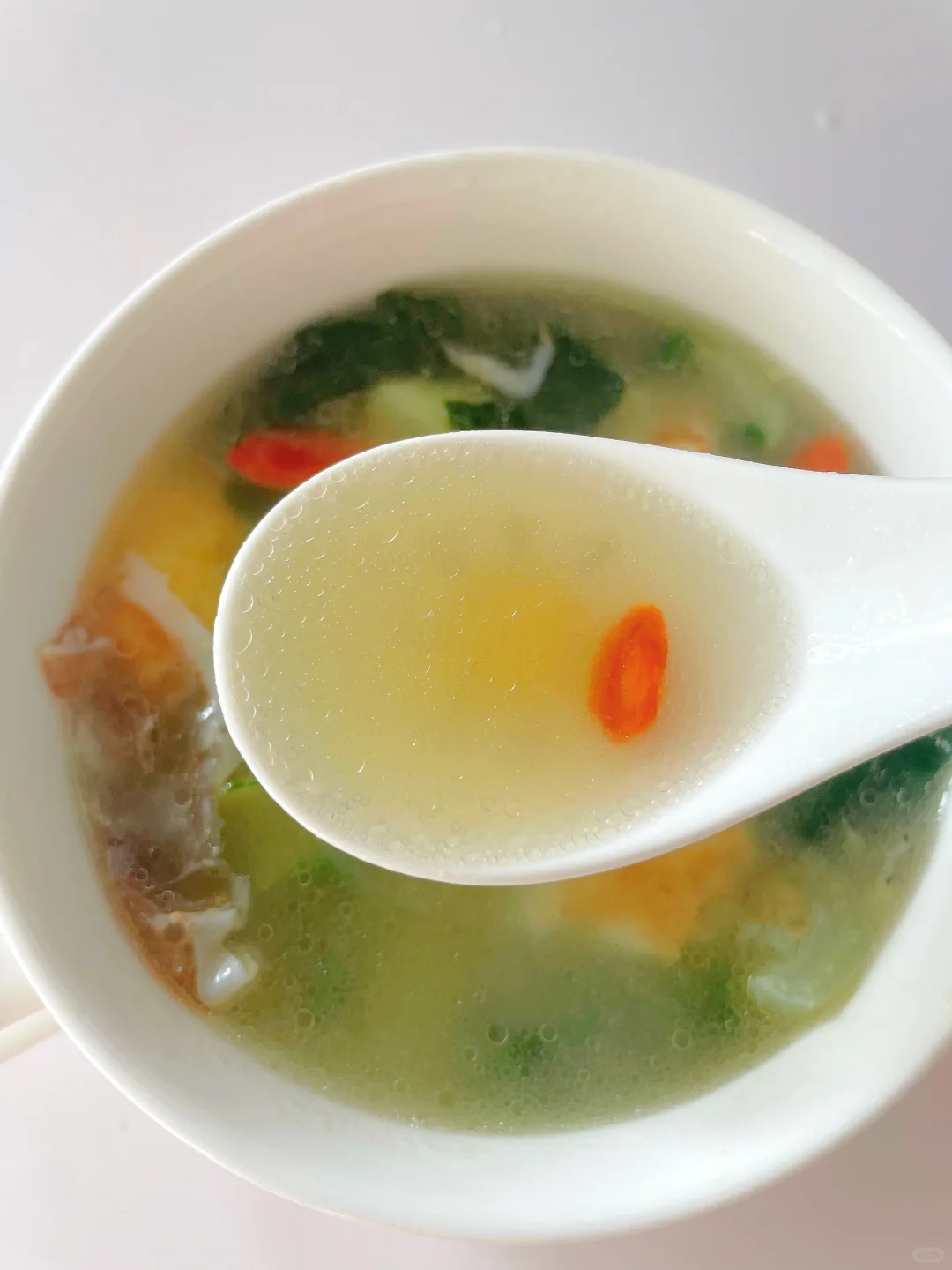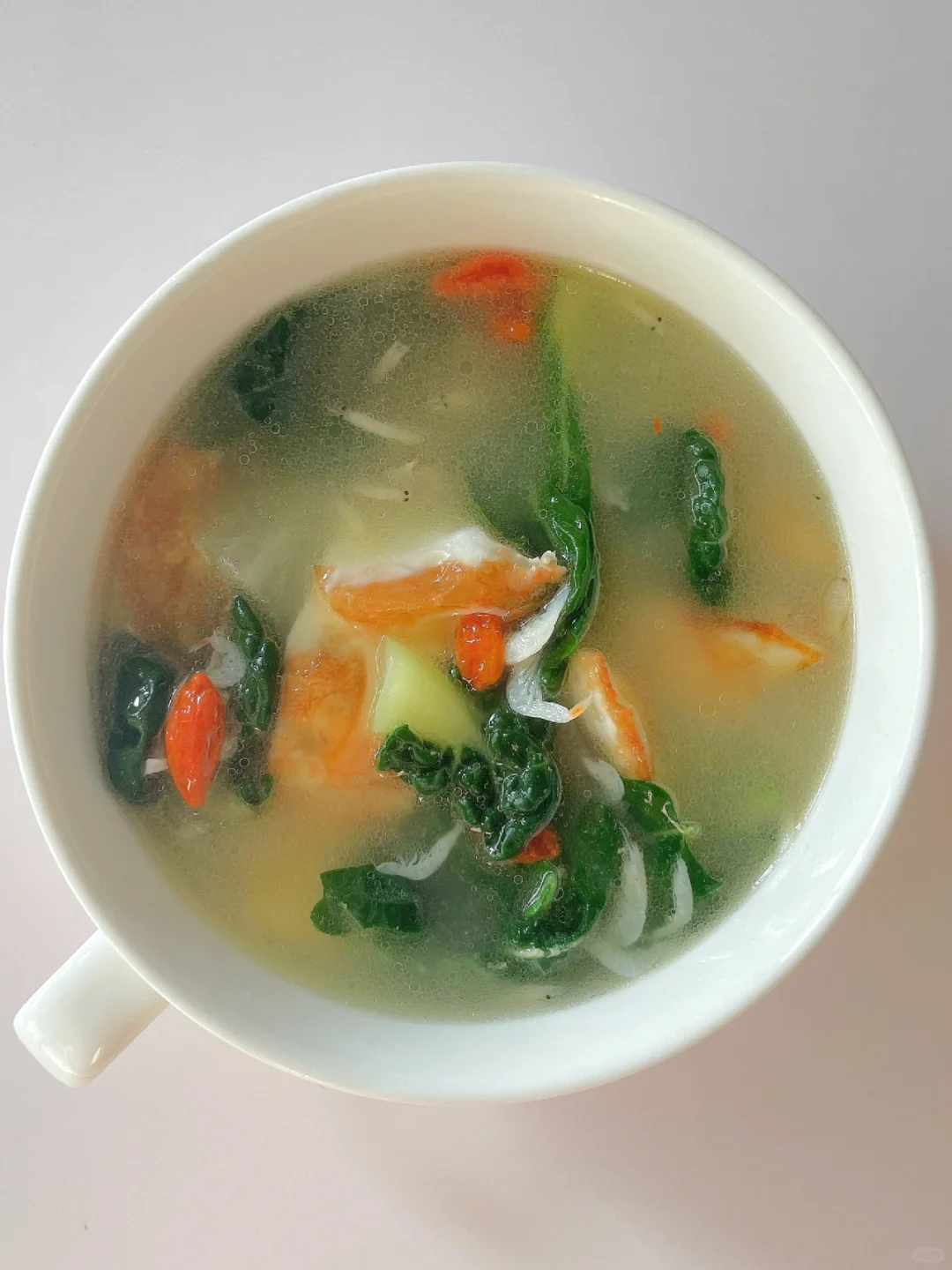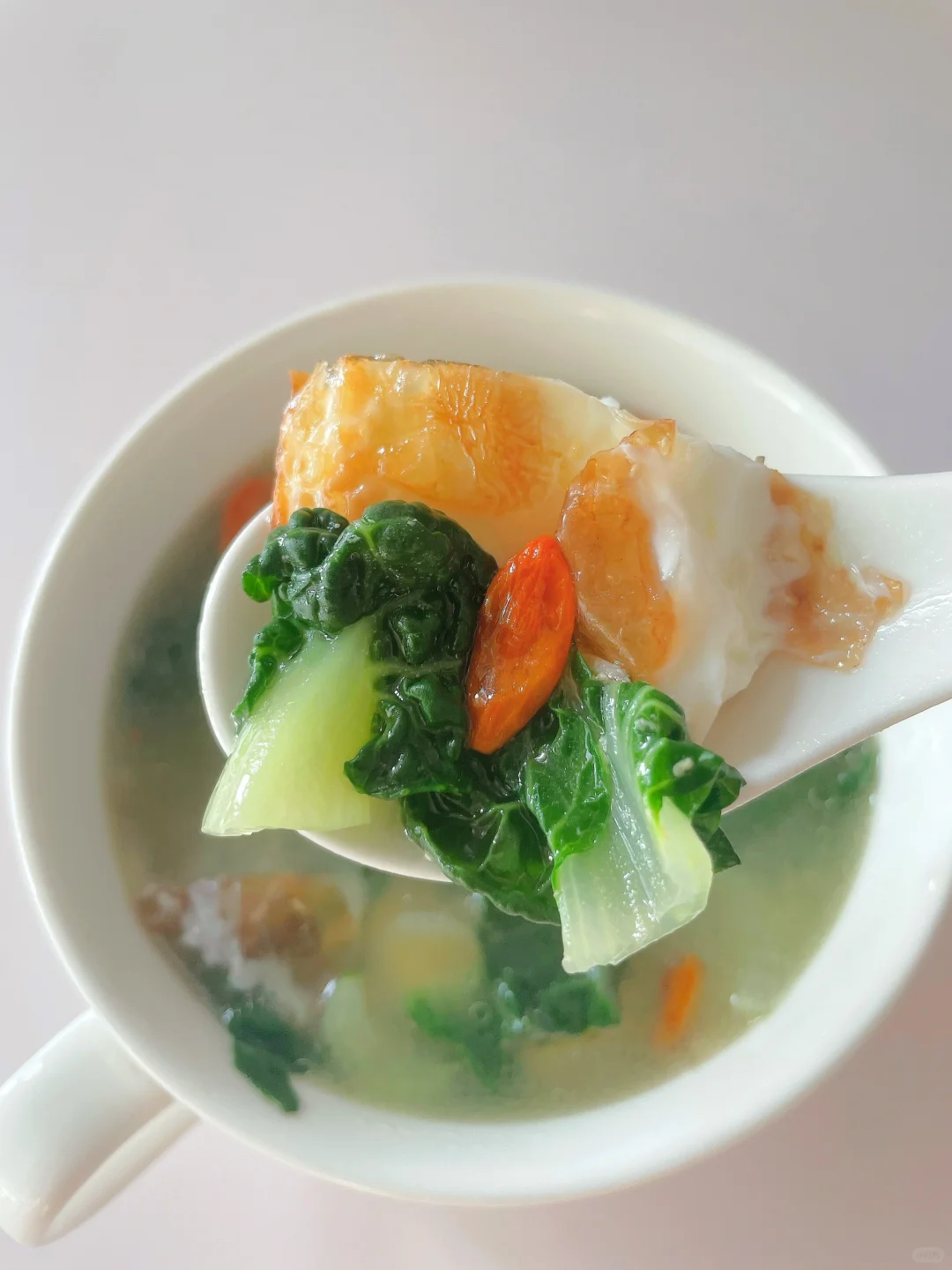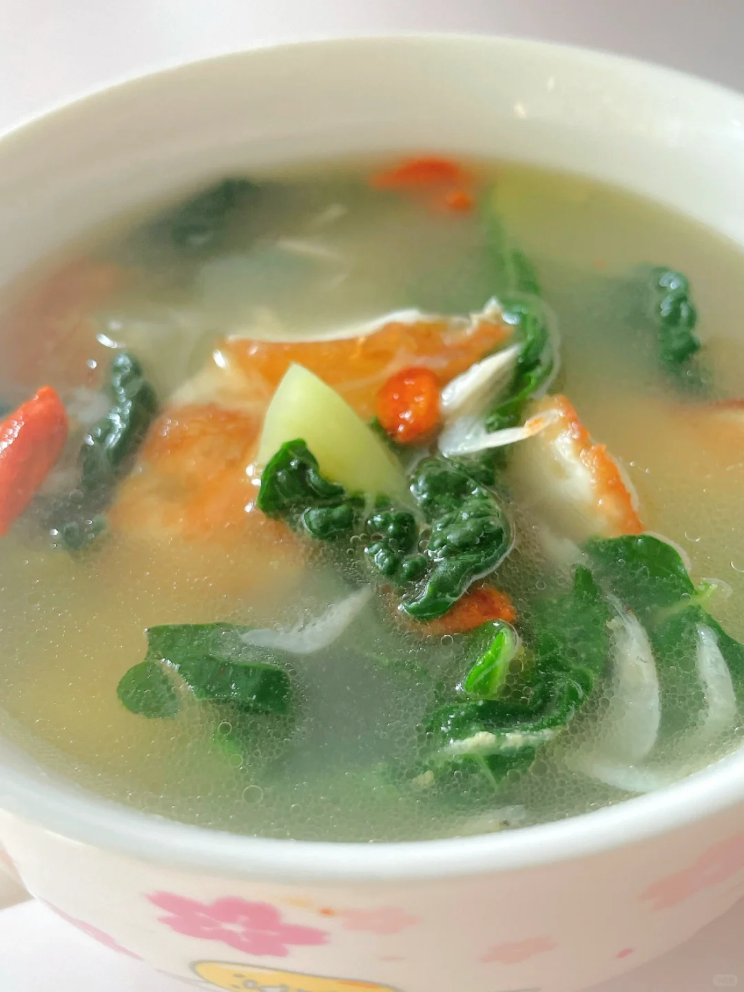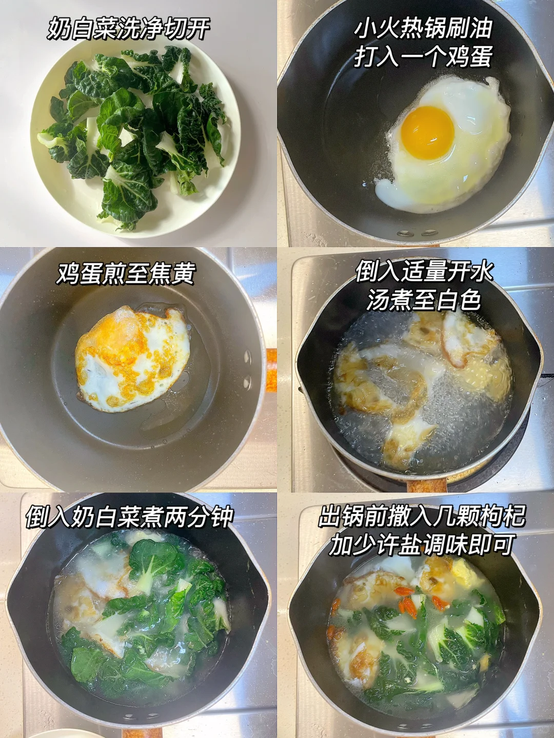 🌈暖心好喝的蔬菜汤~ 🎈准备食材: 1️⃣奶白菜三颗,鸡蛋一个,虾皮适量; 🎈制作步骤: 1️⃣奶白菜洗净切掉根部备用; 2️⃣热锅刷油,打入鸡蛋煎至焦黄,倒入适量开水 (一定要开水哦),煮至沸腾; 3️⃣放入奶白菜煮两分钟,出锅前可以撒入几颗枸杞,再加少许盐调味即可~