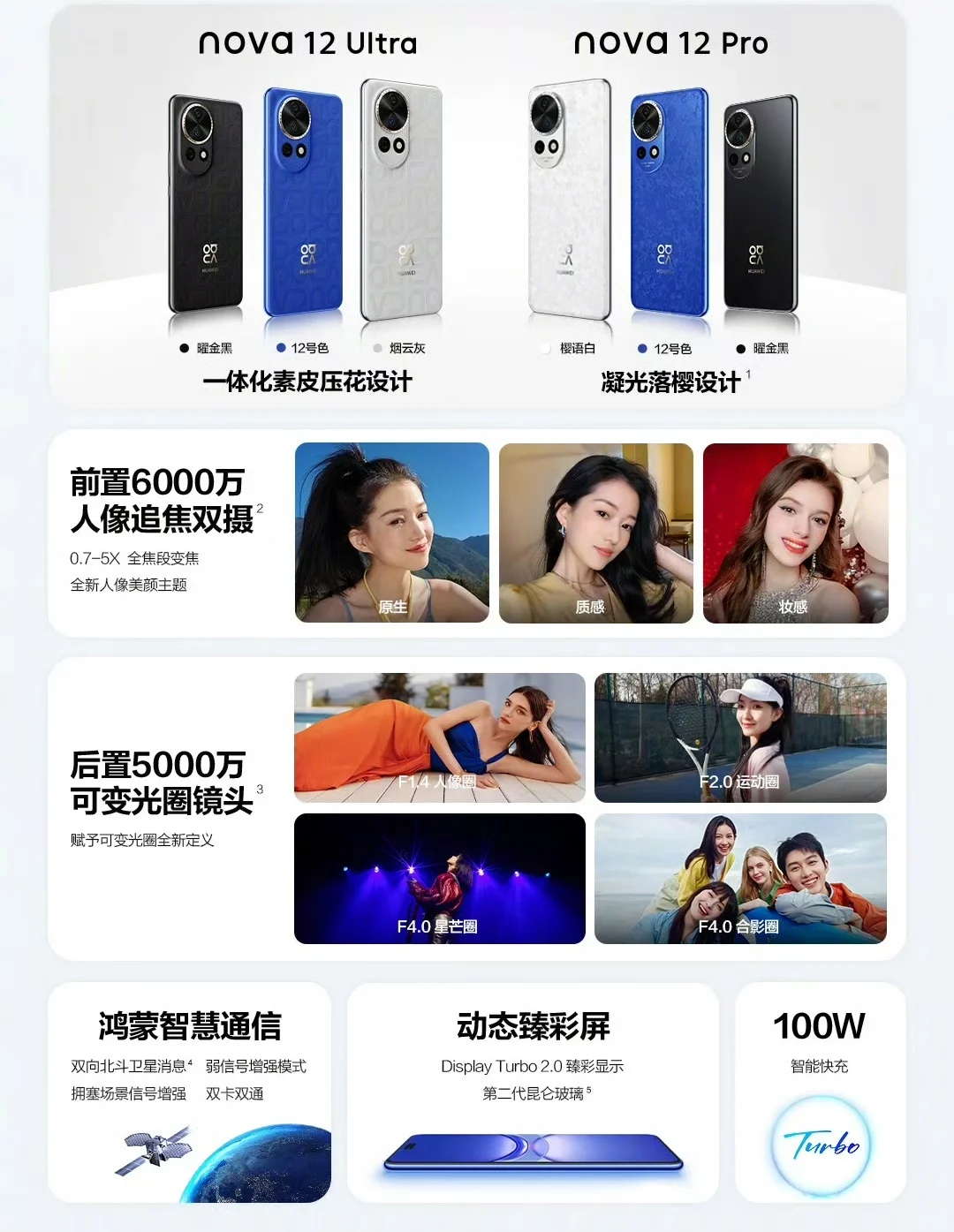 这次 nova12 ultra配置很高啊💯 1️⃣智感支付、隔空操作; 2️⃣智能快充,10分钟快速补电; 3️⃣智能可变光圈; 4️⃣双向北斗卫星消息…… 很多功能旗舰机都体验过了🉐 ✅确实!出色蓝不住 宝子们,nova12系列几款颜色,你更Pick哪个?