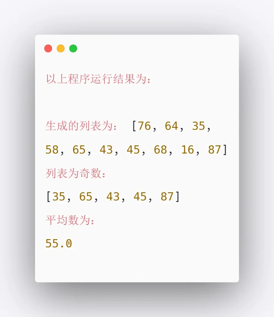 Python小项目[一R][五R][一R] ~ [一R]题目 利用随机函数产生10个1-100的随机整数列表, 把这10个数中的奇数放到一个新列表中并计算出平均值, 输出奇数列表和平均值。 ~ [二R]程序分析 程序使用列表推导式随机生成十个数,然后通过✅for循环🔄遍历列表,判断列表元素是否为奇数,如果为奇数就添加到另外一个列表,最后再求平均值。 ~