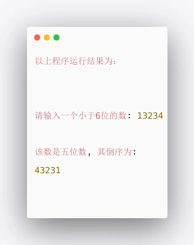 Python小项目[一R][四R][七R] ~ [一R]题目 编写程序,输入一个不多于五位的正整数, 计算它是几位数,并逆序打印出各位数字。 ~ [二R]程序分析 程序先把这个数的5️⃣个位置上的数给计算出来,然后再根据这5️⃣个位置上的数是否为0️⃣判断是几位数,最后再逆序组🈴成新的数。 ~