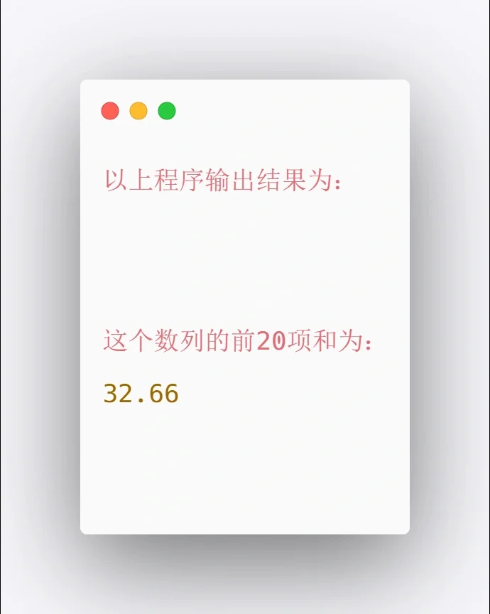 Python小项目[一R][四R][五R] ~ [一R]题目 有一分数序列:2/1,3/2,5/3,8/5,13/8… 编写程序求出这个数列的前20项之和。 ~ [二R]程序分析 这个分数序列有一个☝️规律就是:从第三项开始,每一项都等于前两项之和,因此做法类似于斐波那契数列。 ~