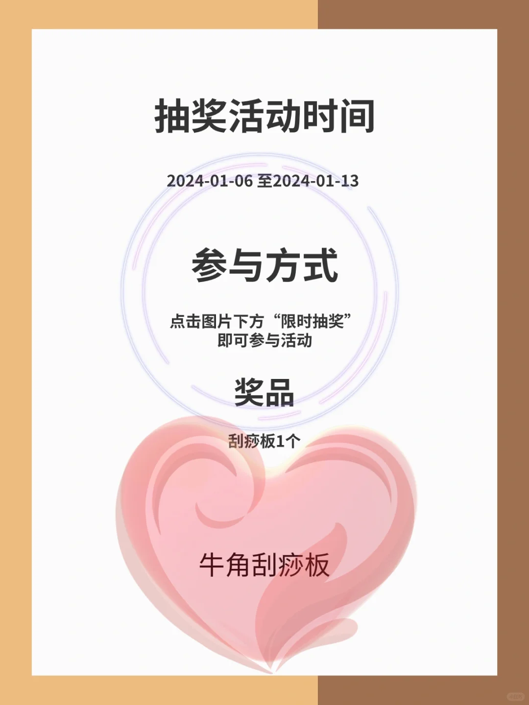 粉丝抽奖福利 牛角刮痧板0元领取, 抽奖获得 - ✅适用于:面部、肩颈、四肢、背部等; ✅天然牛角制作,手工打磨 ✅圆润光滑厚实 - 刮痧(Skin scraping),是传统的自然疗法之一。它是以中 医皮部理论为基础,用器具(牛角、玉石、火罐)等在皮肤相关部位刮拭,以达到疏通经络、活 血化瘀之目的。 - 👉抽奖时间:2024-01-06 00:00:00至2024-01-13 00:00:00 👉开奖时间:2024-01-13 15:00:00 👉奖品:牛角刮痧板,厚0.7cm左右 👉奖品数量:1份 👉参与方式:图片左下,限时抽奖 🔺抽奖规则 系统随机抽取,随机抽取1名幸运参与者 ⚠️温馨提示 ❗️中奖者需7天内提交收件地址,逾期未填写,中奖资格作废。