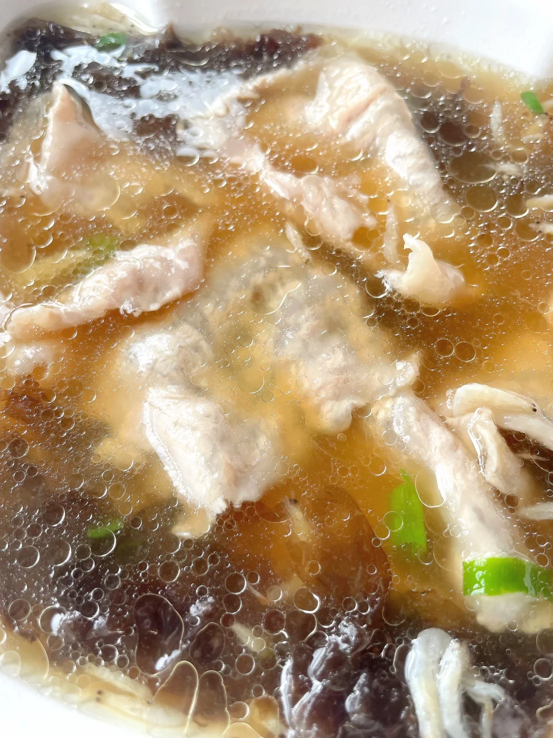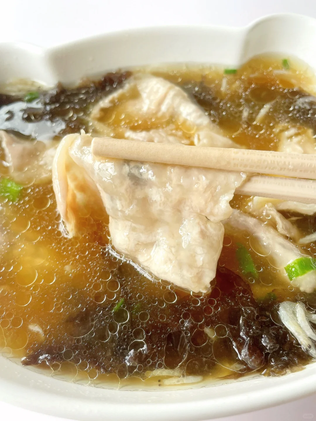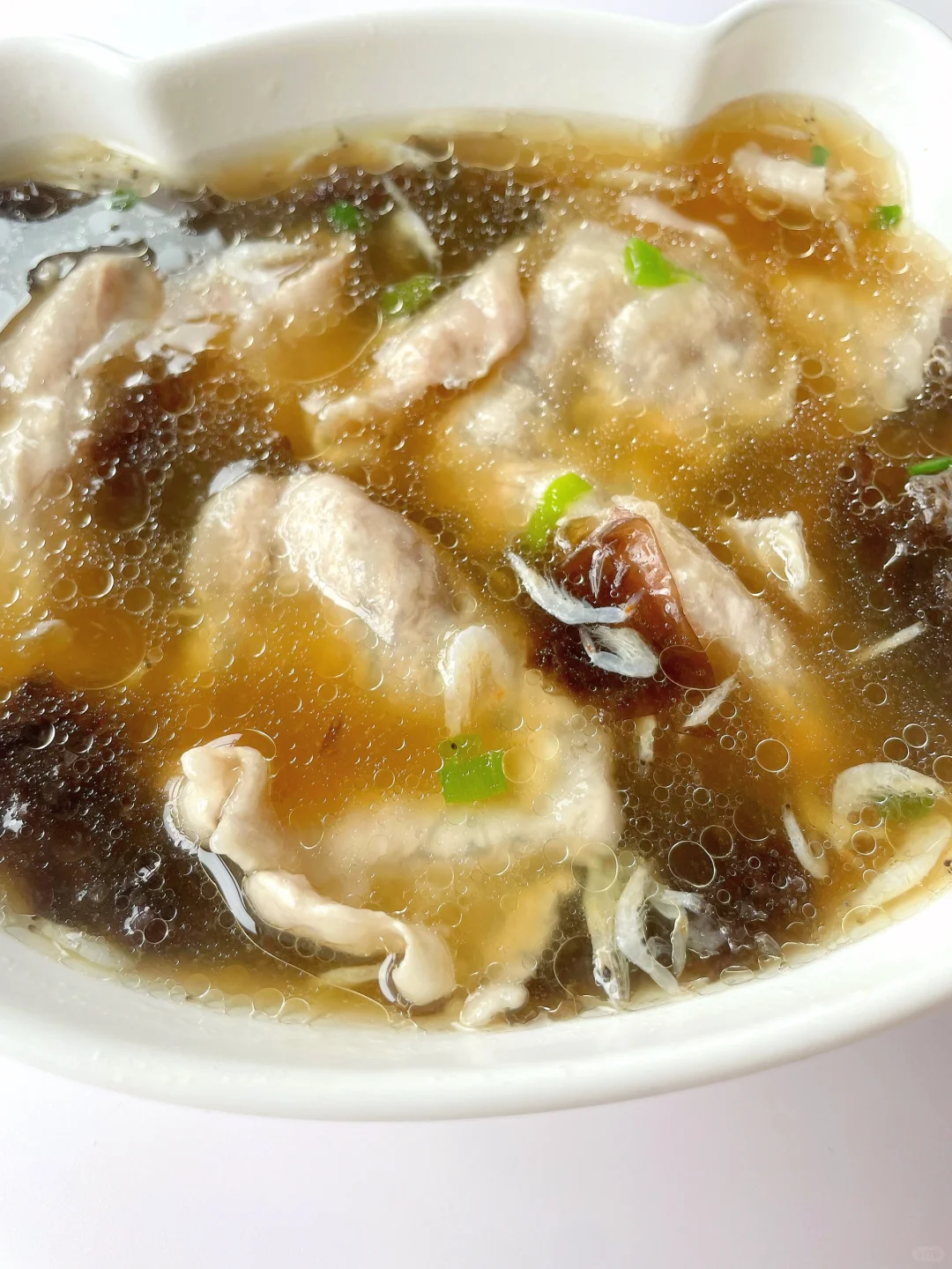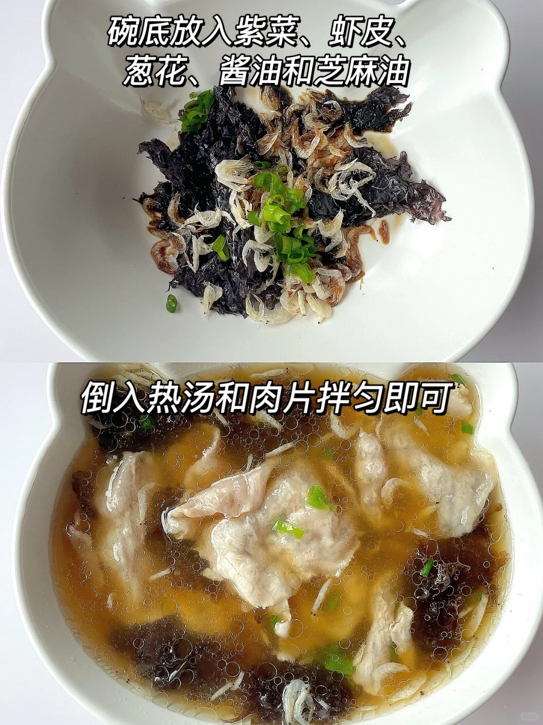 3️⃣碗底放入紫菜,虾皮,葱花,酱油和几滴麻油,把热汤和肉片倒入碗中,搅拌均匀即可。